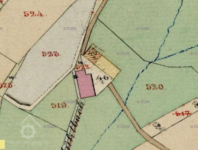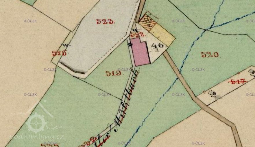 V berní rule z roku 1656 se uvádí Matěj Krejsner, který měl od vrchnosti pronajatý mlýn s jedním kolem. Tereziánský katastr tu k roku 1757 uvádí mlynáře ve mlýně o jednom kole na nestálé vodě. Dle dominikálu byl mlýn vrchnostenský. Na I. Vojenském mapování není, ale mapa je rozdělena a hůře čitelná. Skica a otisk stabilního katastru 1838 -  jedna spalná a jedna nespalná budova do tvaru V ale budovy nespojené, nad mlýnem rybníček, majitelem Georg Riederer. Sommerova topografie k roku 1839 uvádí jeden mlýn. Původní obyvatelstvo bylo německé národnosti.