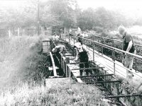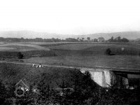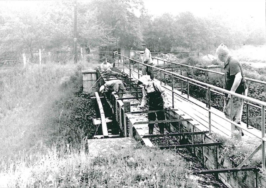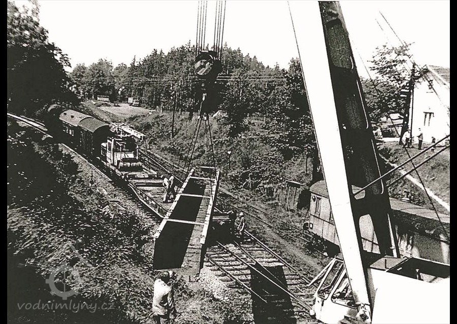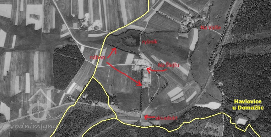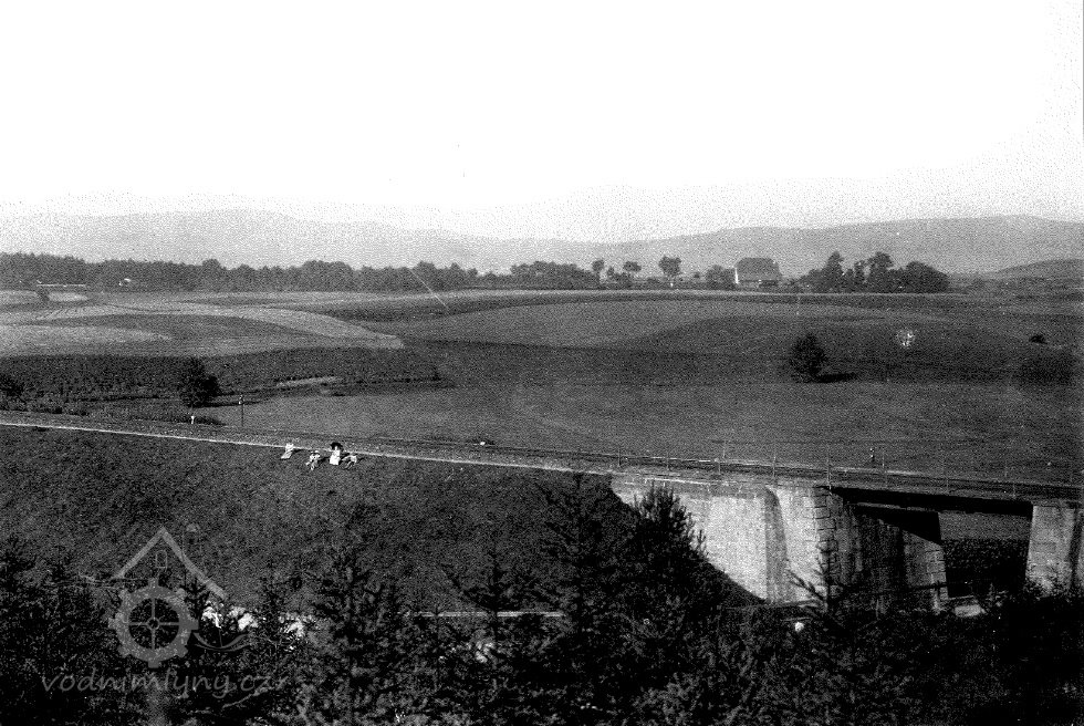 1950 – v krajině od akvaduktu zřetelný náhon, u pily velká skládka dřeva, náhon pokračuje okolo rybníka dále na Valchu.