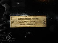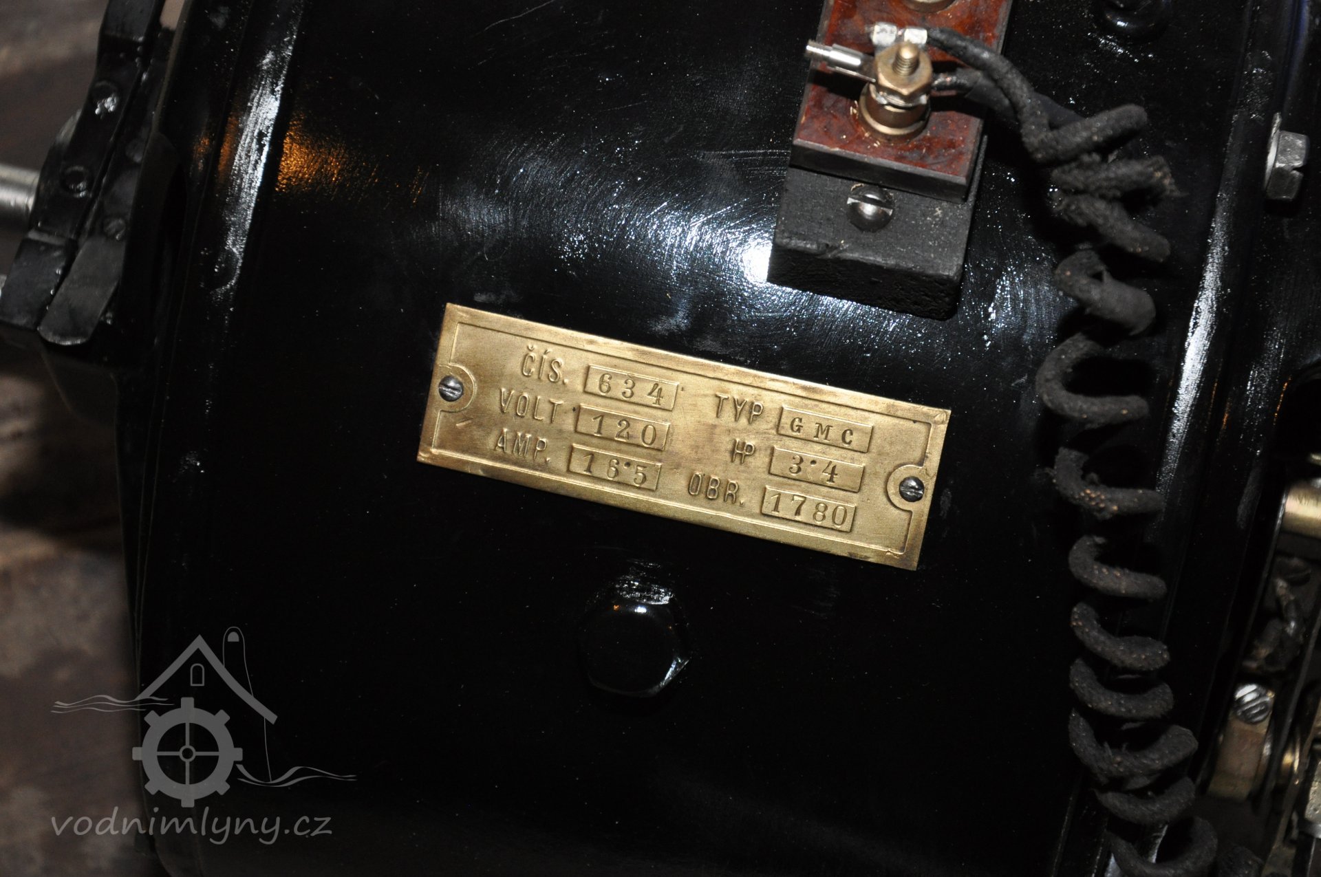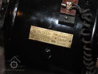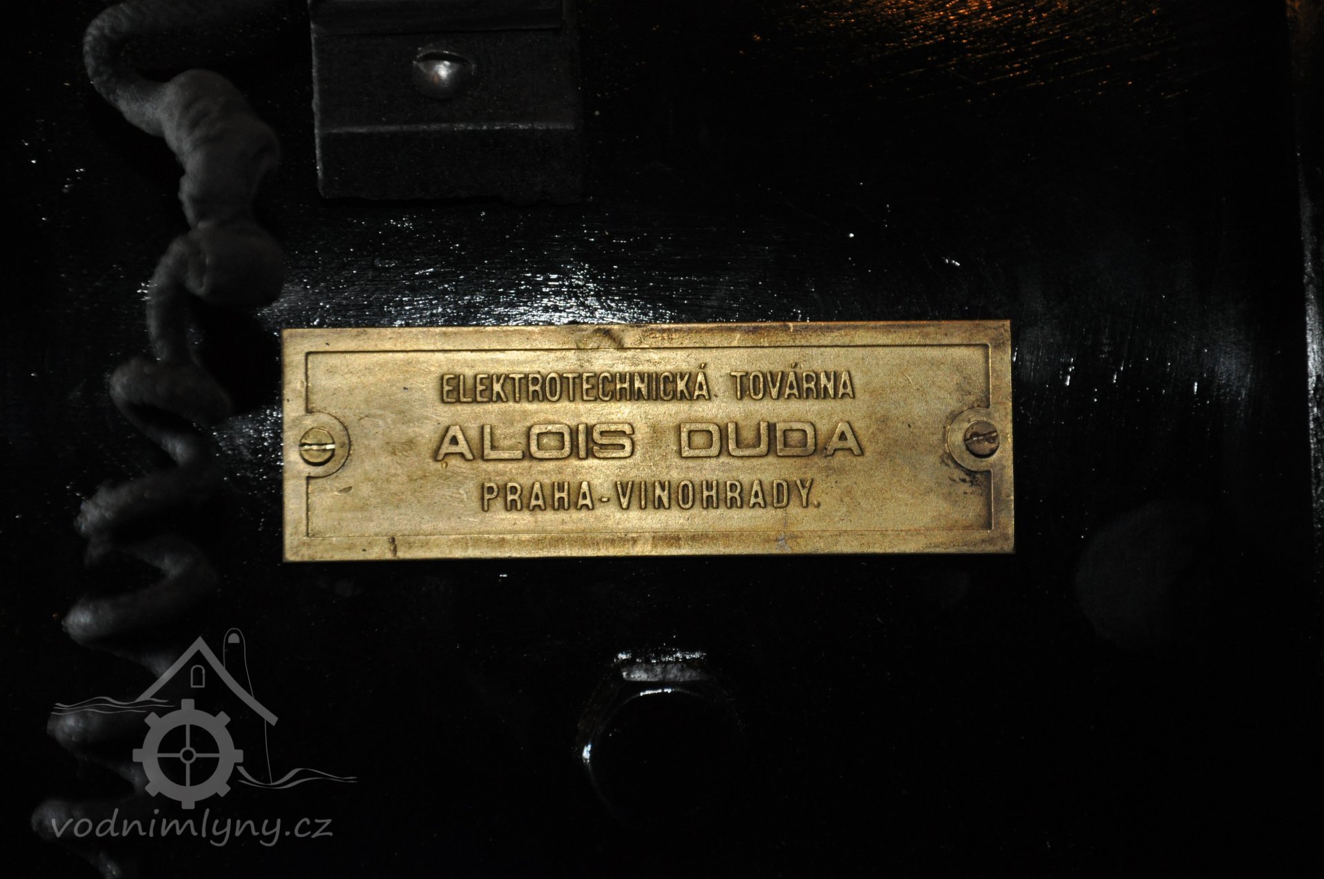 štítek na dynamu Alois Duda - Praha Vinohrady, vyrobené kolem roku 1910, 2018, © David Veverka - restaurátor strojů, (Prvky na obrázku: Generátor, dynamo, značka výrobce na technologickém vybavení, výroba elektrické energie)