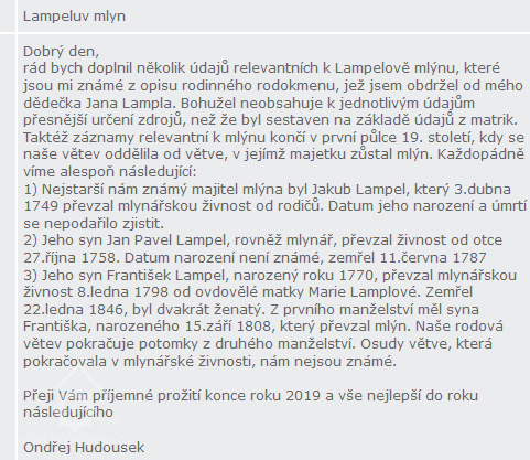 1758 - jeho syn Jan Pavel Lampel, rovněž mlynář, převzal živnost od otce 27.října 1758. Datum narození není známé, zemřel 11.června 1787