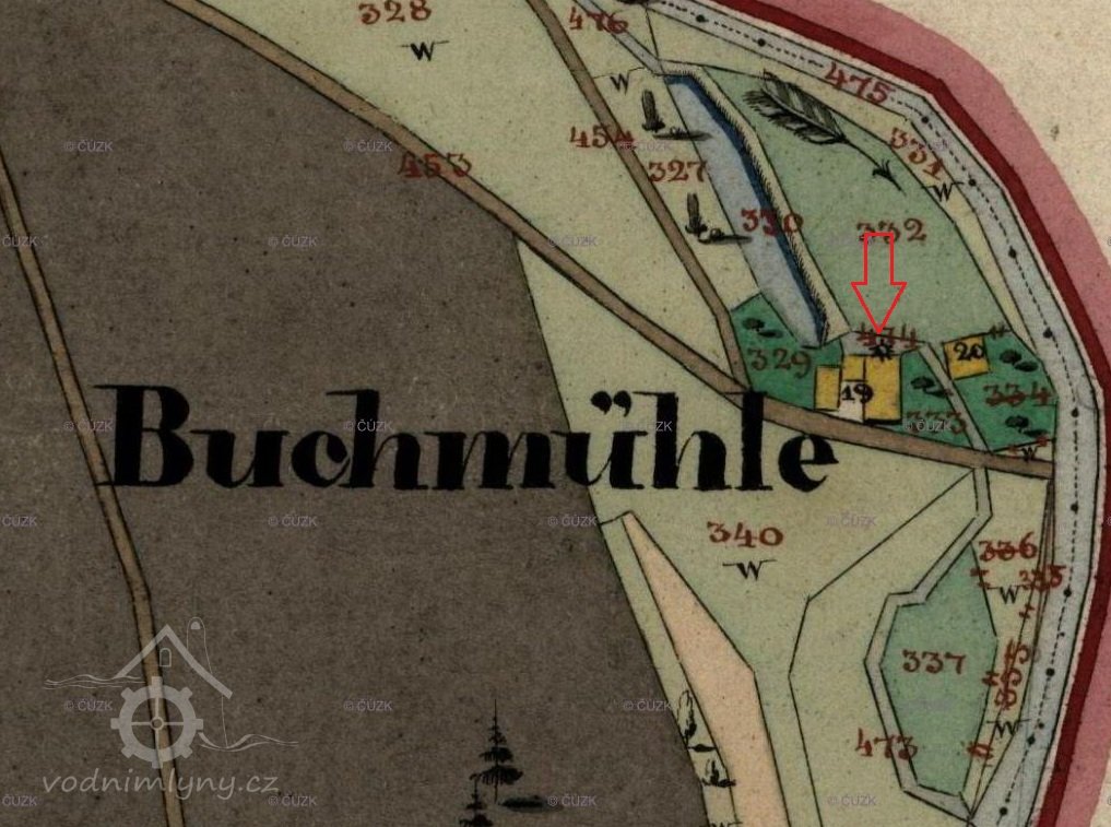 Mlýn byl založen tepelským klášterem patrně v 1. polovině 18. století, objevuje se na mapách I. vojenského mapování z let 1764 – 1768. V roce 1798 se objevuje pod názvem Puchmühle, v 19. století je na mapách označen pod názvem Buchmühle nebo Buhmühle. Spadal pod pístovskou faru.