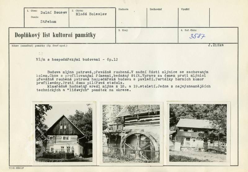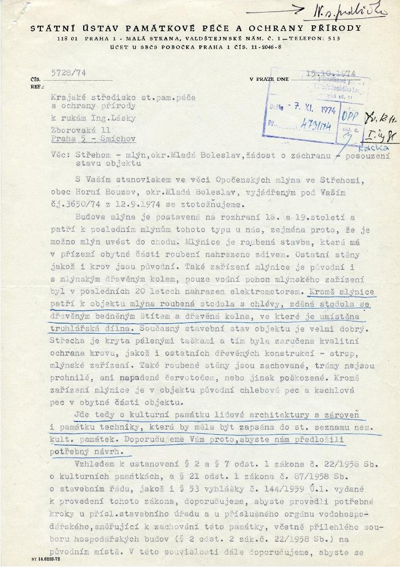 S Vaším stanoviskem ve věci Opočenských mlýna ve Střehomi, obec Horní Bouzov, okr. Mladá Boleslav, vyjádřeným pod Vaším čj.3650/74 z 12.9.1974 se ztotožňujeme. Budova mlýna je postavená na rozhraní 18. a 19. století a patří k posledním mlýnům tohoto typu u nás, zejména proto, že je možno mlýn uvést do chodu. Mlýnice je roubená stavba, která má v přízemí obytné části roubení nahrazeno zdivem. Ostatní stěny jakož i krov jsou původní. Také zařízení mlýnice je původní i s mlýnským dřevěným kolem, pouze vodní pohon mlýnského zařízení byl v posledních 20 letech nahrazen elektromotorem. Kromě mlýnice patří k objektu mlýna roubená stodola a chlév, zděná stodola s dřevěným bedněným štítem a dřevěná kolna, ve které je umístěna truhlářská dílna. Současný stavební stav objektu je velmi dobrý. Střecha je kryta pálenými taškami a tím byla zaručena kvalitní ochrana krovu, jakož i ostatních dřevěných konstrukcí - strop, mlýnské zařízení. Také roubené stěny jsou zachované, stěny nejsou prohnilé, ani napadené červotočem, nebo jinak poškozené. Kromě zařízení mlýnice je v objektu původní chlebová pec a kachlová pec v obytné části objektu. Jde tedy o kulturní památku lidové architektury a zároveň i památku techniky, která by měla být zapsána do st. seznamu nem. kult. památek. Doporučujeme Vám proto, abyste nám předložili potřebný návrh. Vzhledem k ustanovení § 2 a § 7 odst. 1 zákona č. 22/1956 Sb. o kulturních památkách, a to 21. odst. 1 zákona Č. 87/1958 Sb. o stavebním řádu, jakož i § 53 vyhlášky č. 144/1959 Ú.l. vydané k provedení tohoto zákona, doporučujeme, abyste provedli potřebné kroky u přísl. stavebního úřadu a u příslušného orgánu vodohospodářského, směřující k zachování této památky, včetně přilehlého souboru hospodářských budov (§ 2 odst. 2 zák. č. 22/1958 Sb.) na původním místě. V této souvislosti dále doporučujeme, abyste se si spolu se svým odborem ochrany přírody pokusili vyhledat pro sobotecký vodovod jiná vhodná prameniště, jejichž exploatace by zachování této kulturní památky na původním místě neohrožovala. Kdyby se však ukázalo, že důležitý vodohospodářský zájem nelze uspokojit jiným způsobem a že demolice objektu je nezbytná, pak bude třeba trvat na tom, aby jako vyvolaná investice byl ohrožený soubor, tj. vlastní budova mlýna s mlýnským zařízením, chlebovou pecí a kachlovou pecí, jakož i další dřevěné objekty (roubená stodola s chlévy a dřevěná kolna) byly na náklad investora vodního díla přemístěny podle odborných pokynů pam. orgánu do Muzea vesnice v Kouřimi, které je složkou Regionálního muzea v Kolíně. Pří těchto jednáních bude třeba přihlížet i k tomu, že rovněž nedaleká usedlost čp. 11 ve Střehomi je kulturní památkou. Závěrem doporučujeme, abyste v této věci nadále spolupracovali také s vedoucím správy chráněné krajinné oblasti Český ráj v Turnově, s. M. Pojkarem.