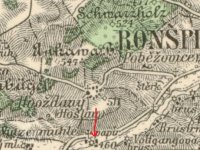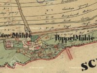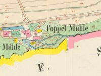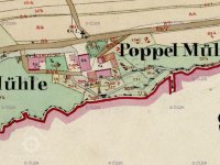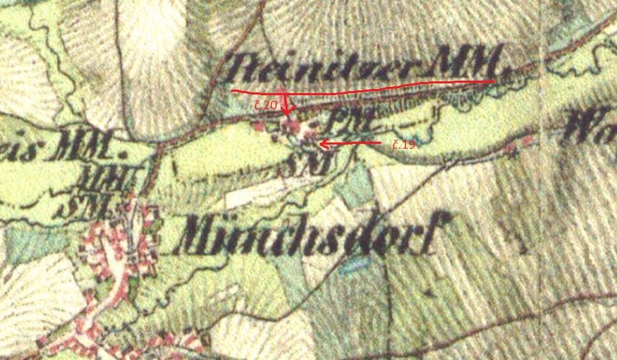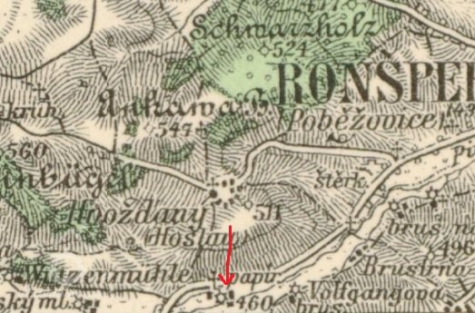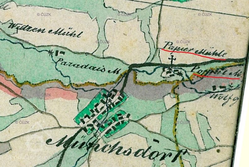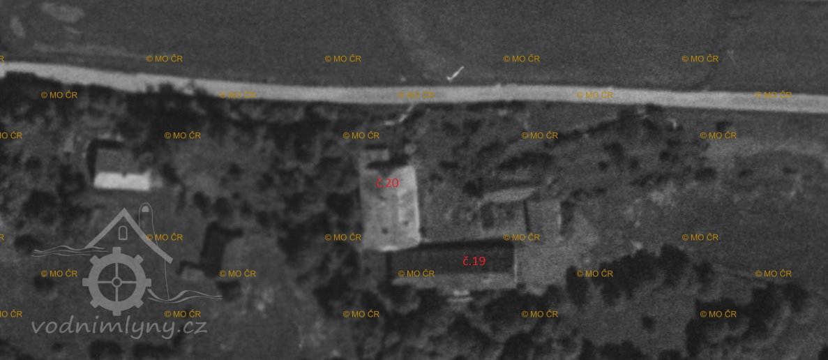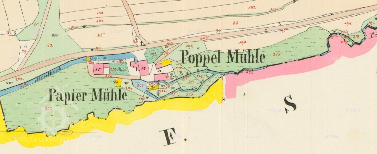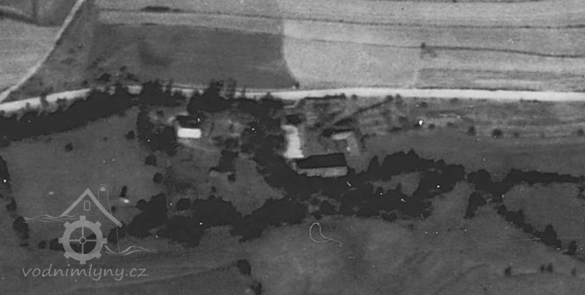 1838 - nespalná budova bez značky vodního kola, náhon vede vnitřkem budovy, majitelem Andreas Ziegler