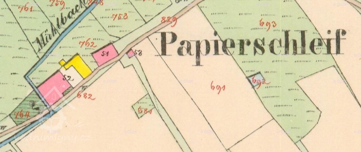 Původně velice starý a zajímavý provoz. V historických pramenech je nazýván Horní šitbořskou leštírnou, Papierschleife nebo Schlösschen – Zámeček. Již v 17. století stávala v těchto místech papírna pivoňského kláštera, jejíž pustnoucí stavbu obnovil v roce 1746 pivoňský převor Cyriak Wotava. Provoz je zobrazen na I. vojenském mapování – josefském (1764-1768 a 1780-1783). V roce 1824 vyměnil zdejší papírník Josef Bock (Beck) starou papírnu s Janem Wolfgangem Zieglerem za papírnu na východním okraji Poběžovic. V letech 1835 – 1836 zde Wolfgang dal upravit starou papírnu na brusírnu a vystavět obytnou budovu, nazývanou Schlösschen. O budově tzv. Zámečku, postaveného v těsné blízkosti leštírny, kolovaly pověsti o tom, že tu prý straší.