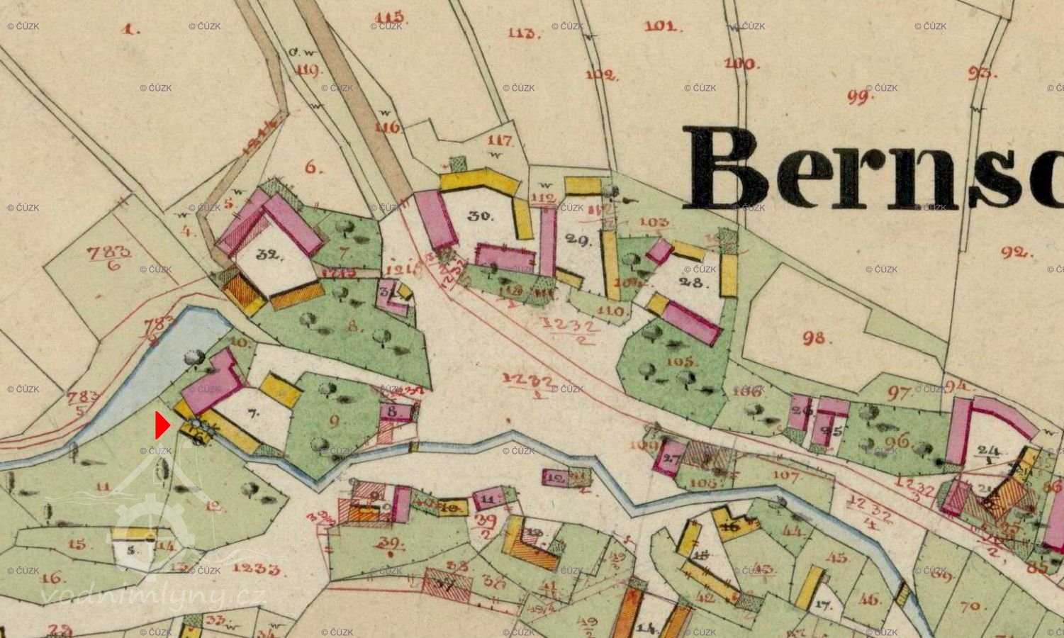 Voda z potoka parc.č.1235 se shromažďuje u mlýna v nádržce na způsob rybníka, odkud je vedena otvorem prkny vybedněným ve světlosti 0,26 m vysokým , 0,41 m širokým do mlýnského náhonu 7,2 m dlouhého, 2,58 m širokého, 1,0 m vysokého, prkenného, k dvěma vodním kolům na svrchní vodu 5,6 m a 5,31 m v průměru a 0,63 m širokým. Mlýn má 2 složení, mlýnské kameny 0,764 m v průměru. Značka normálu byla vsazena 24.9.1879.
