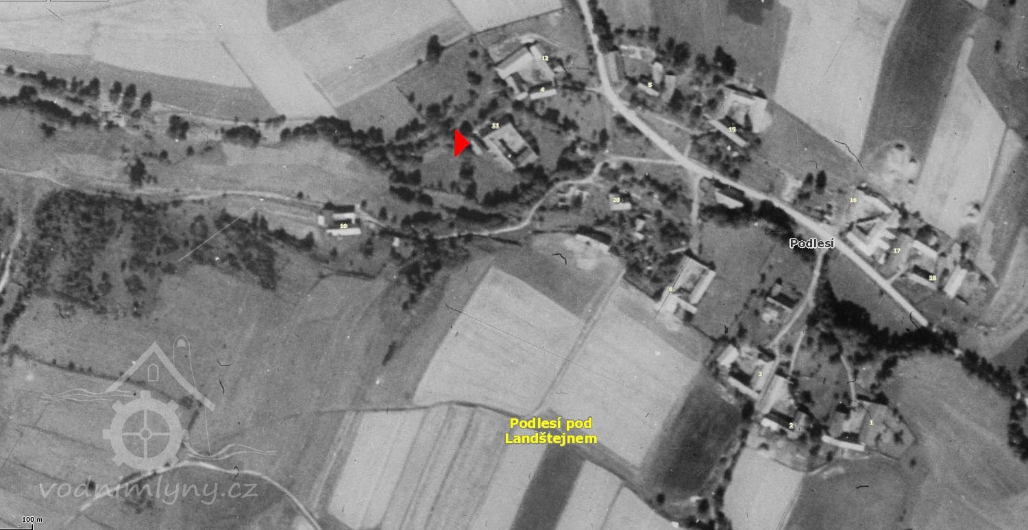 Mlýn v Podlesí pod Landštejnem je čitelnými matrikami doložen koncem 18. století, ale bude starší. Při mlýně je v r. 1930 uváděna i pila. Mlýn byl v provozu na území Sudet po celou dobu 2. světové války. Po následném krátkém uzavření mlel s národním správcem po roce 1945 pro okolní obce. V současnosti je mlýn opuštěn, chátrá, cesta ke mlýnu je zasypaná odpadem a všude vysoké náletové dřeviny a kopřivy.