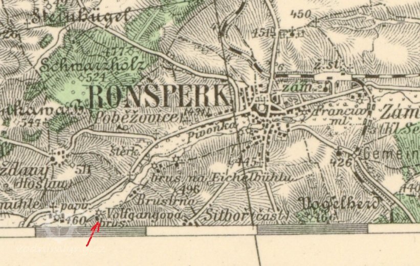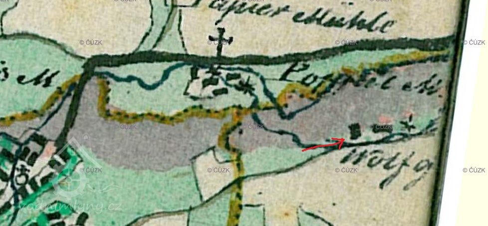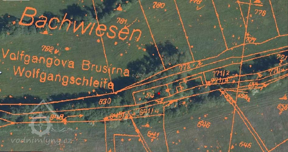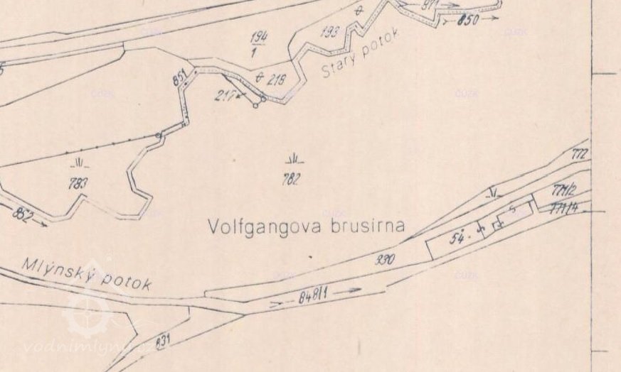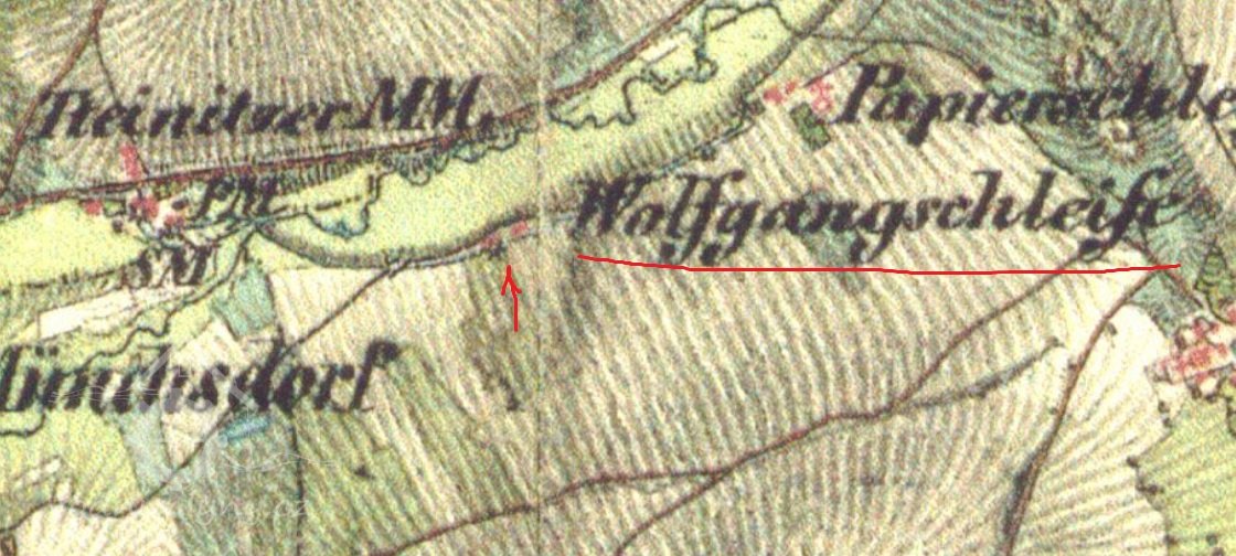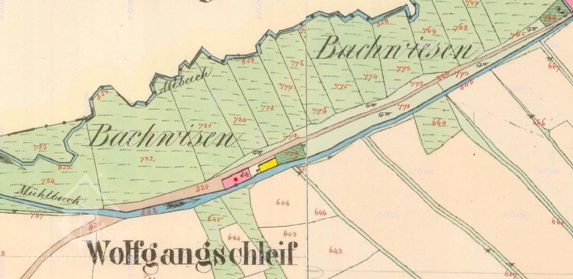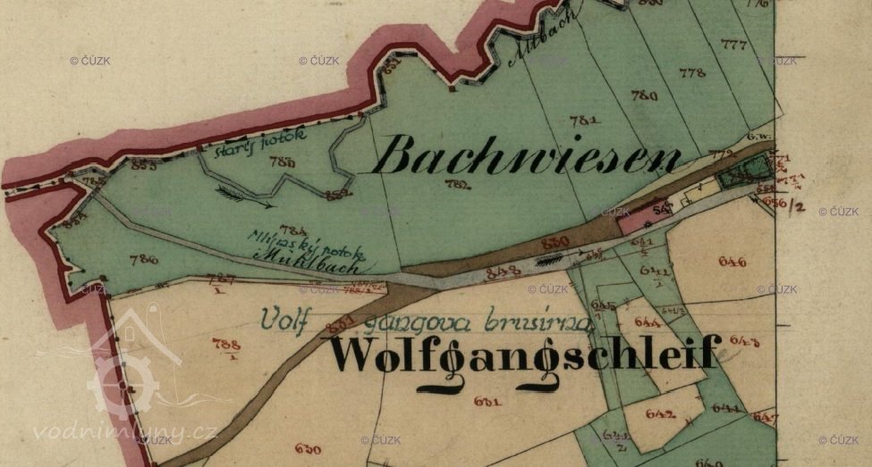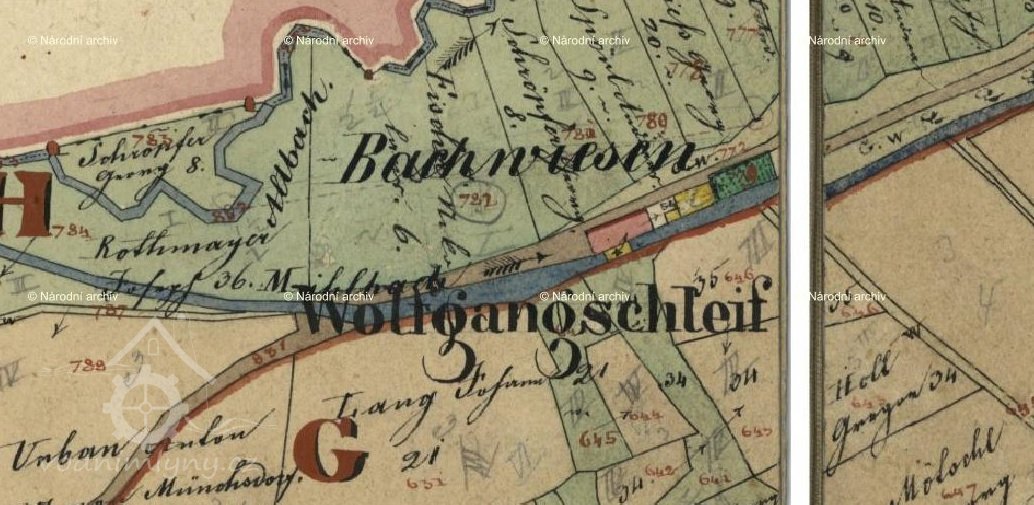 Provoz je jako Wolfgangschleife zobrazen na II. vojenském mapování – Františkovo ( 1836-1852 ). Původně se jednalo o brusírnu skla. Wolfgangschleife byl nazývaný podle zakladatele Wolfganga Zieglera, který je jako majitel uváděn již v roce 1819 a znovu roku 1839. Za Zieglera zde pracovalo až 27 dělníků. Na mapě z roku 1838 je zděná budova šlejfu doplněna další dřevěnou budovou. Náhon, který vedl z Pivoňky lučnatým údolím, byl nazýván Mühlbach. Jeho koryto zaniklo již dávno při regulaci luk.