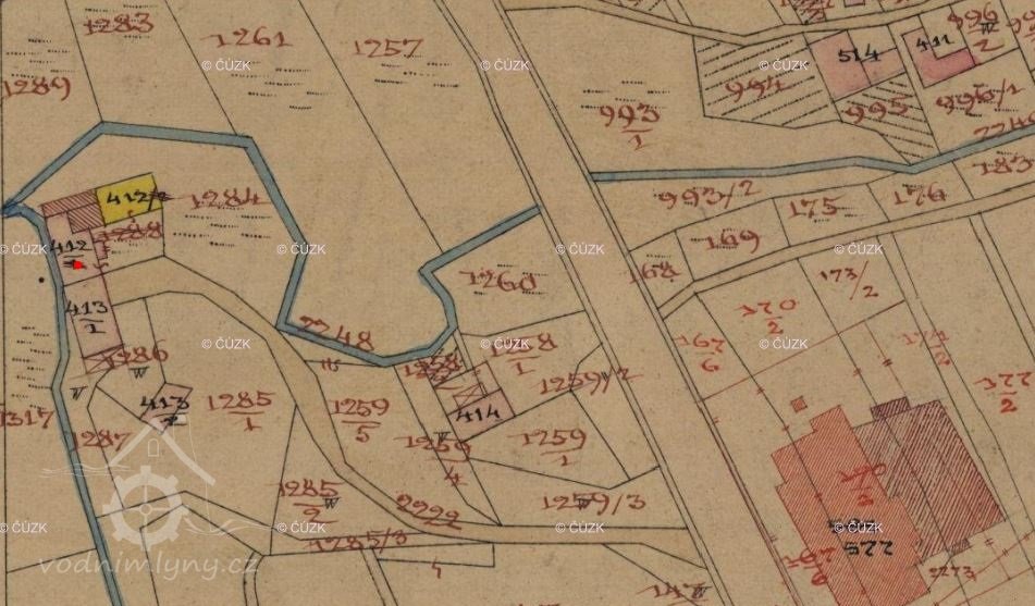 Voda teče od výše položené pily T. Starka příkopen do náhonu 2,12 m širokého, 1 m hlubokého se 3 stavidly, z nichž 2 jsou 0,52 m široká, 0,33 m vysoká a pouští se jimi voda ke složením. Třetím stavidlem se odvádí přebytečná voda a je 0,6 m široké a 0,42 m vysoké. Po použití odtéká voda příkopem a je zčásti využívána k zavodňování luk.