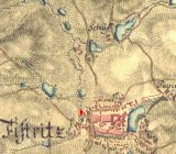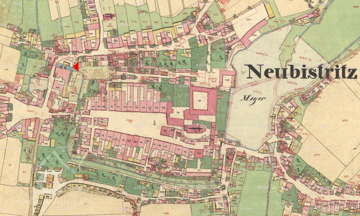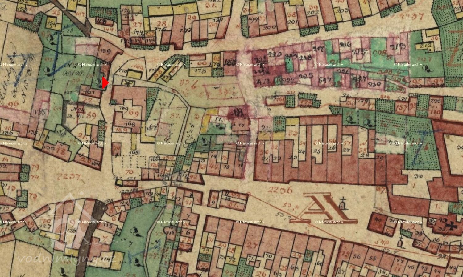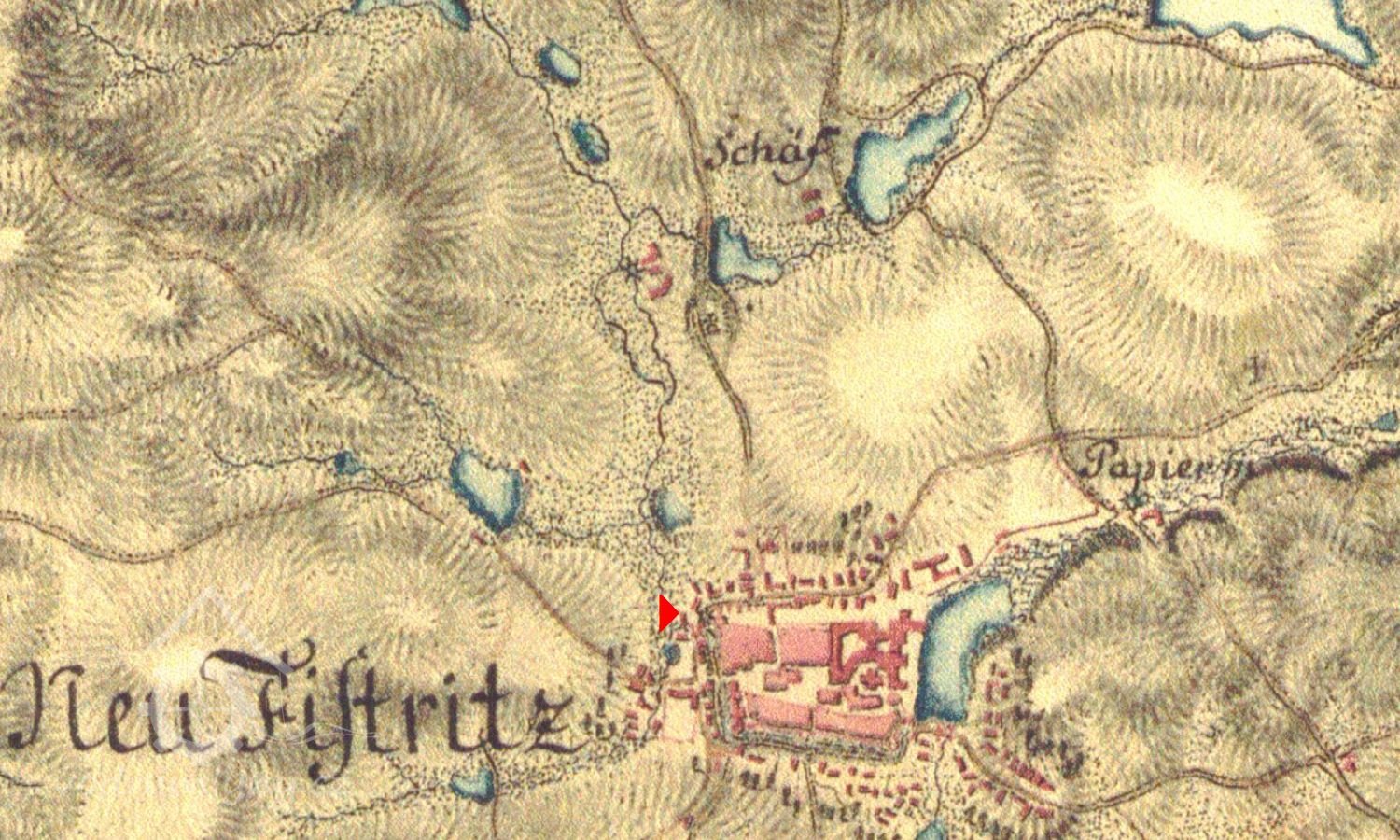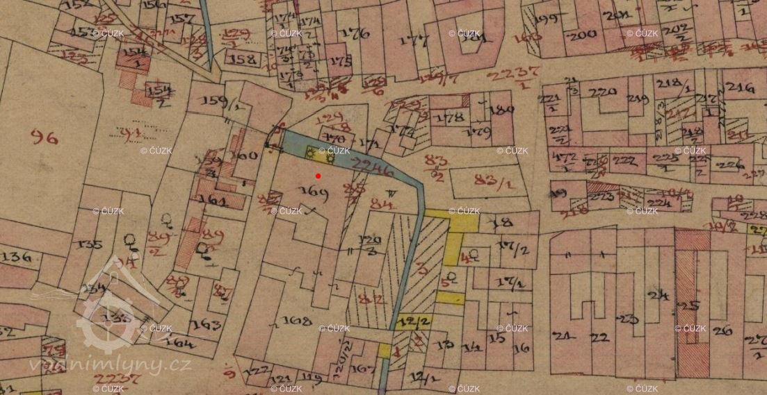 Voda teče od wurmfeldské valchy příkopem městem do horního žlabu u mlýna 10,4 m dlouhého, 2,24 m širokého, 0,69 m vysokého, ve kterém jsou stavidla. Od tohoto žlabu odbočuje na pravé straně žlab k pile.