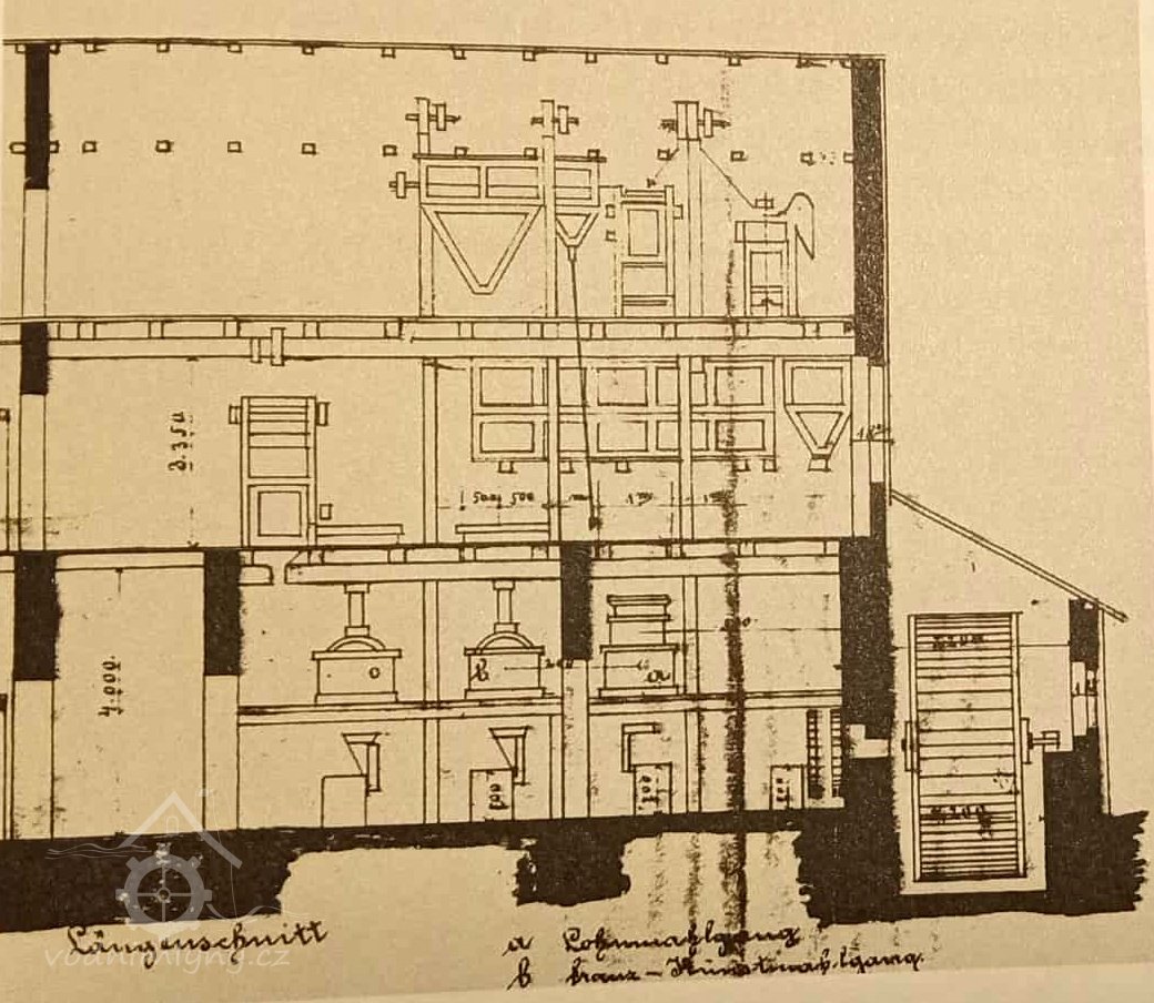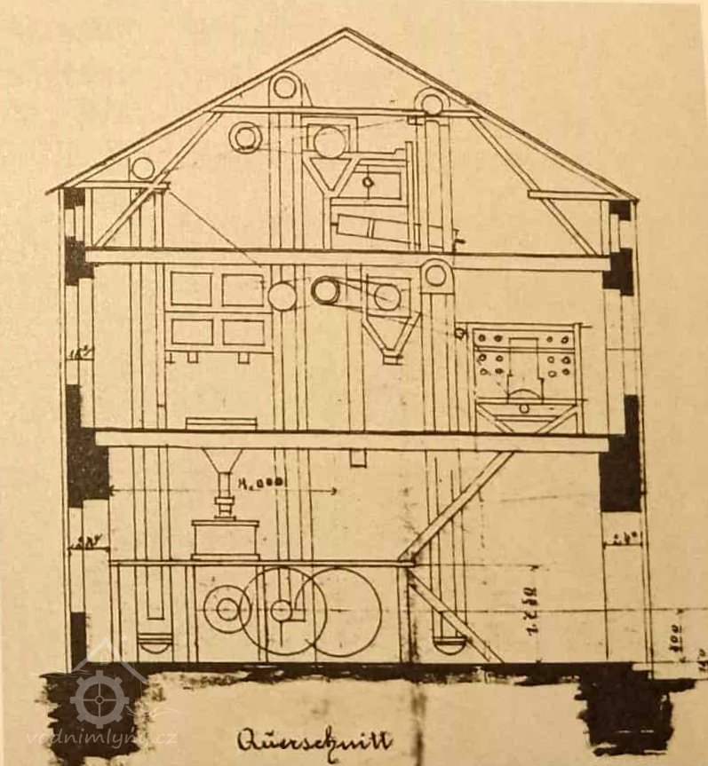 1879: plán mlýna zachycuje umělecké složení s mlecími kameny. Jeho strojní vybavení je podobné kolínskému mlýnu, mele pšenici technologií navysoko, ale je již o mnoho modernější. K přenosu pohonu mezi jednotlivými patry používá ploché řemeny, jak můžeme usuzovat ze zakreslených řemenic. V podstřeší čistí obilí hranolový vysévač, tarár a válcový triér a loupe jej už tzv. Euréka. K vysévání meliva stály na třetí podlaze malý a velký hranolový vysévač a tamtéž je zakreslená dokonce i savka ke třídění a čištění krupice.