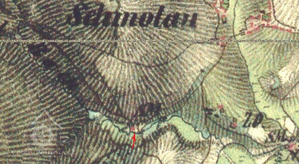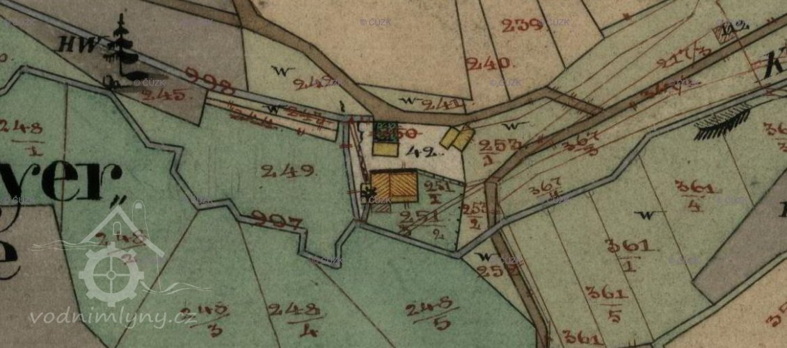 Popis1930 – Seznam a mapa vodních děl Republiky československé uvádí Karlův potok – Smolov – Jindřich Kotz – mlýn – 1 kolo na svrchní vodu – 0,086-6,14-4,4