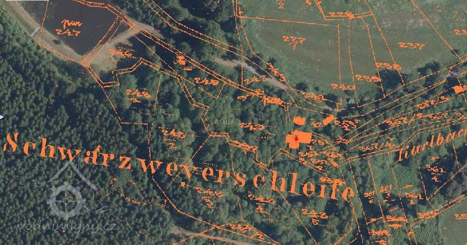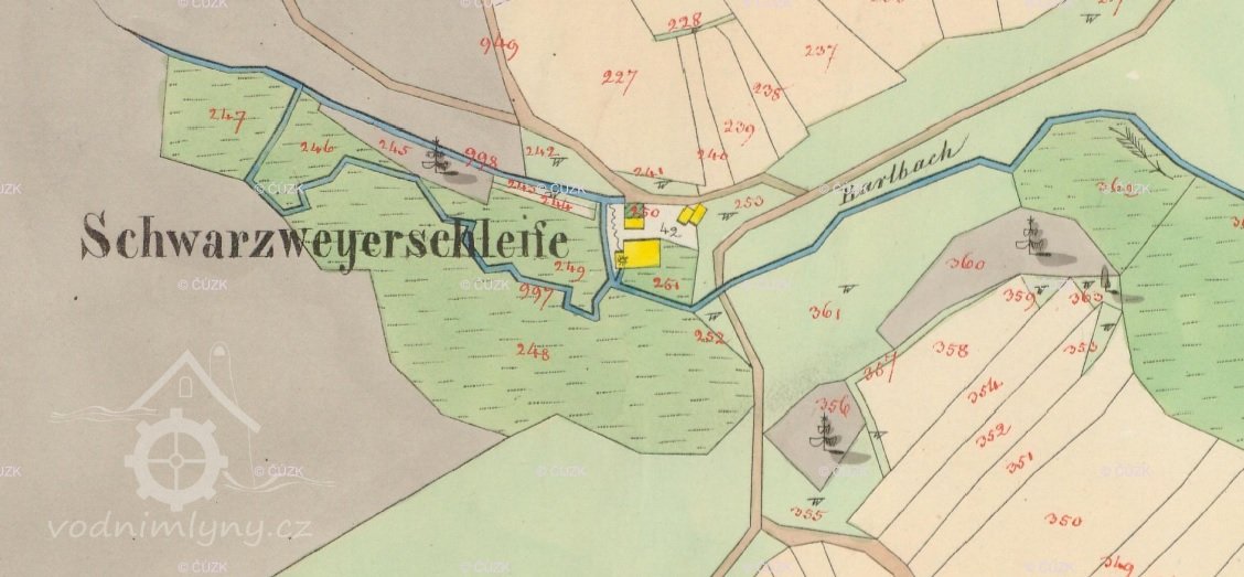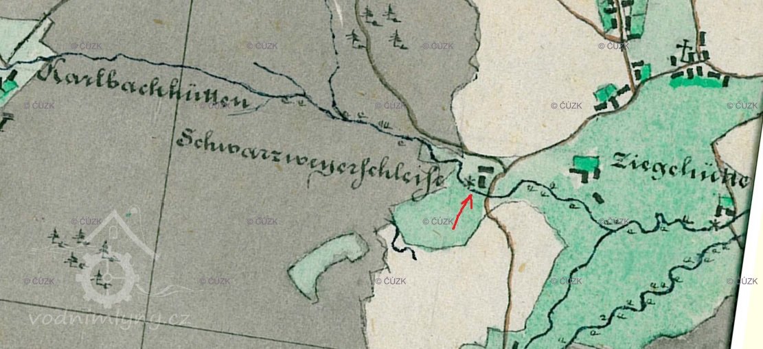Lokalita Schwarzweier, někde nazývaná Schwarzsäge, se nachází v údolí Huťského potoka (dříve Karlbach) u cesty ze Smolova do Karlovy Hutě. Původně objekt fungoval jako brusírna skla patřící pod Neuhofer Spiegelfabrique, následně pila a mlýn.