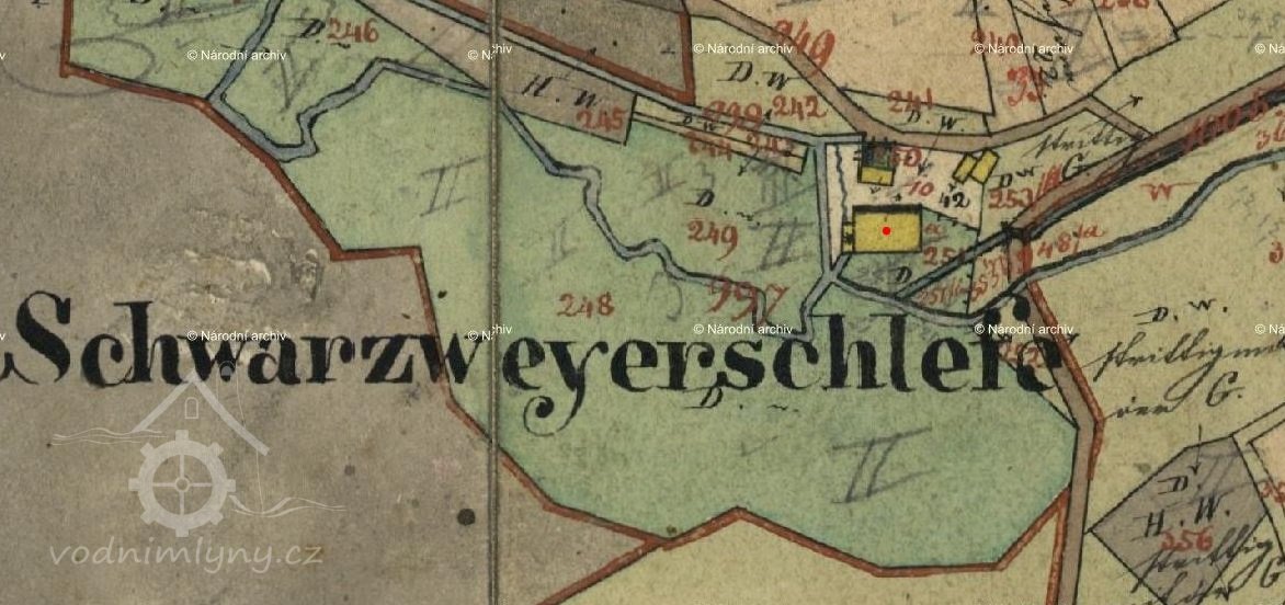 1930 – Seznam a mapa vodních děl Republiky československé uvádí Karlův potok – Smolov – Jindřich Kotz – mlýn – 1 kolo na svrchní vodu – 0,086-6,14-4,4