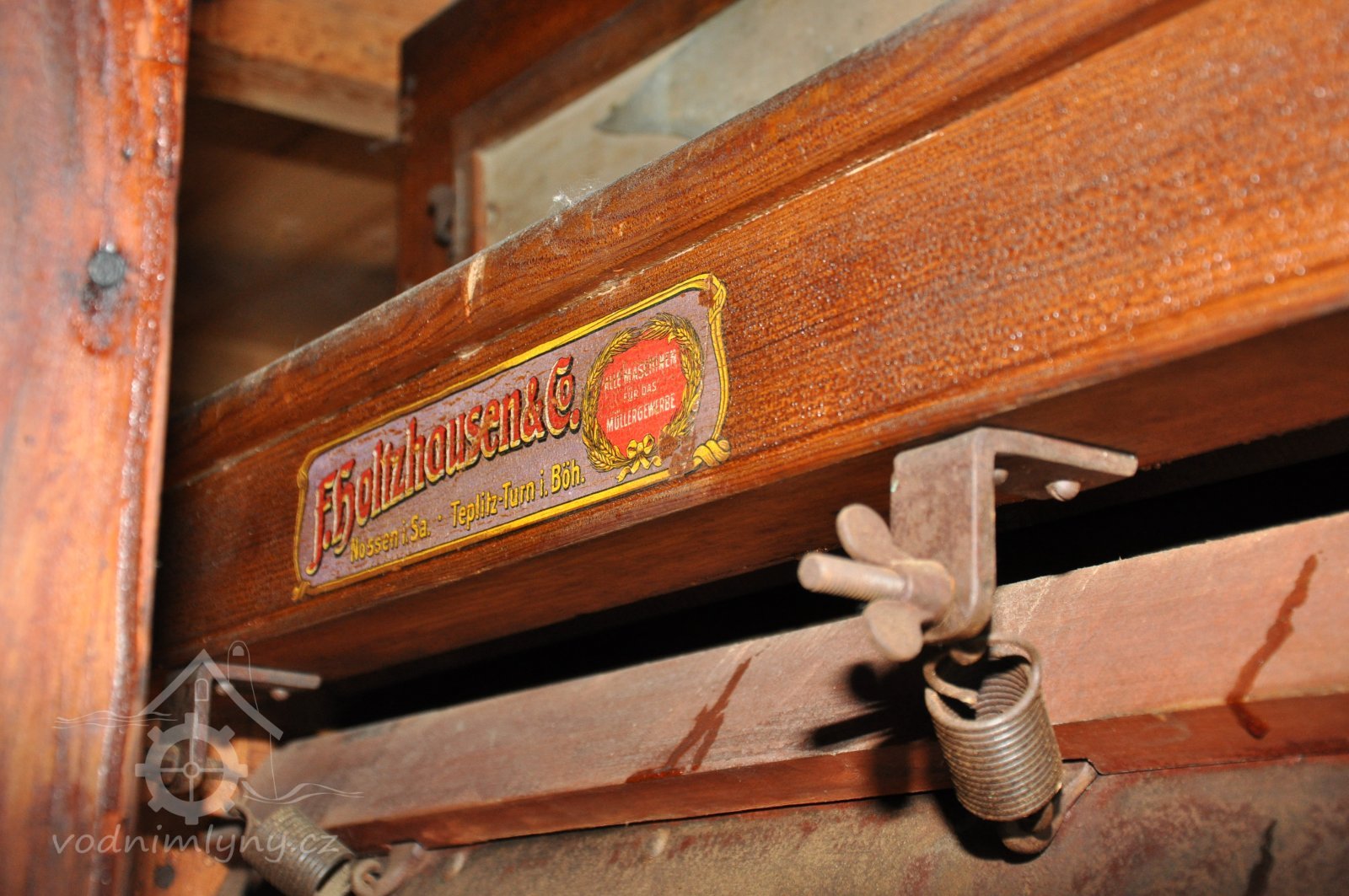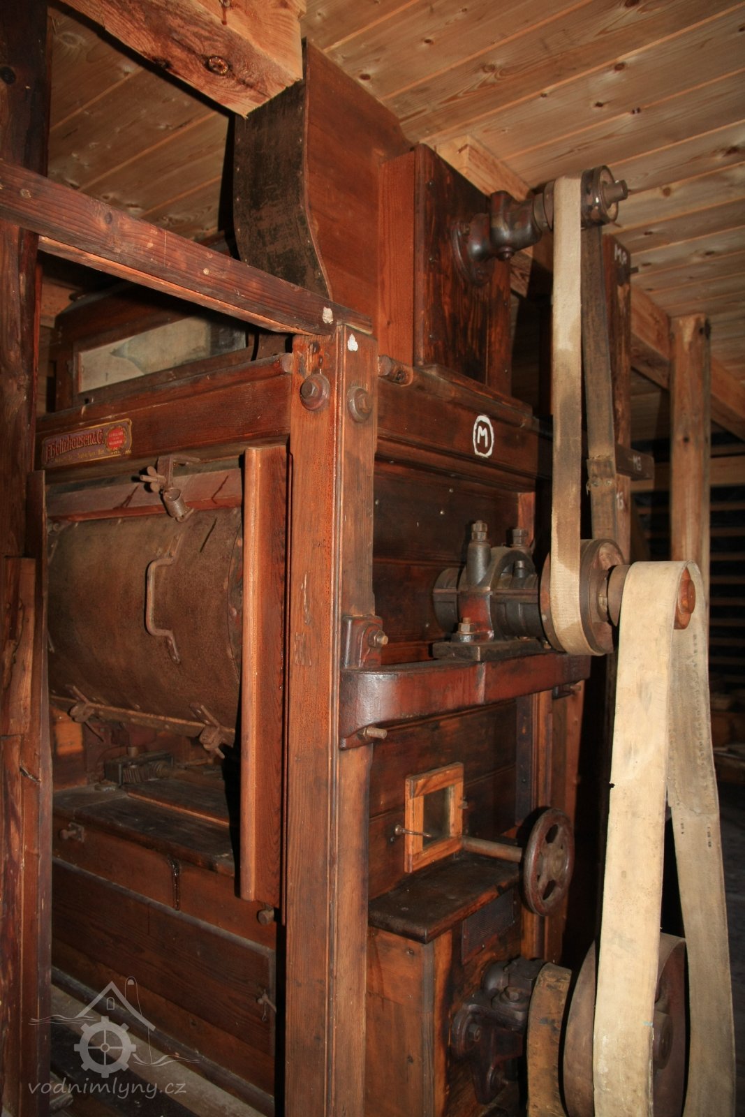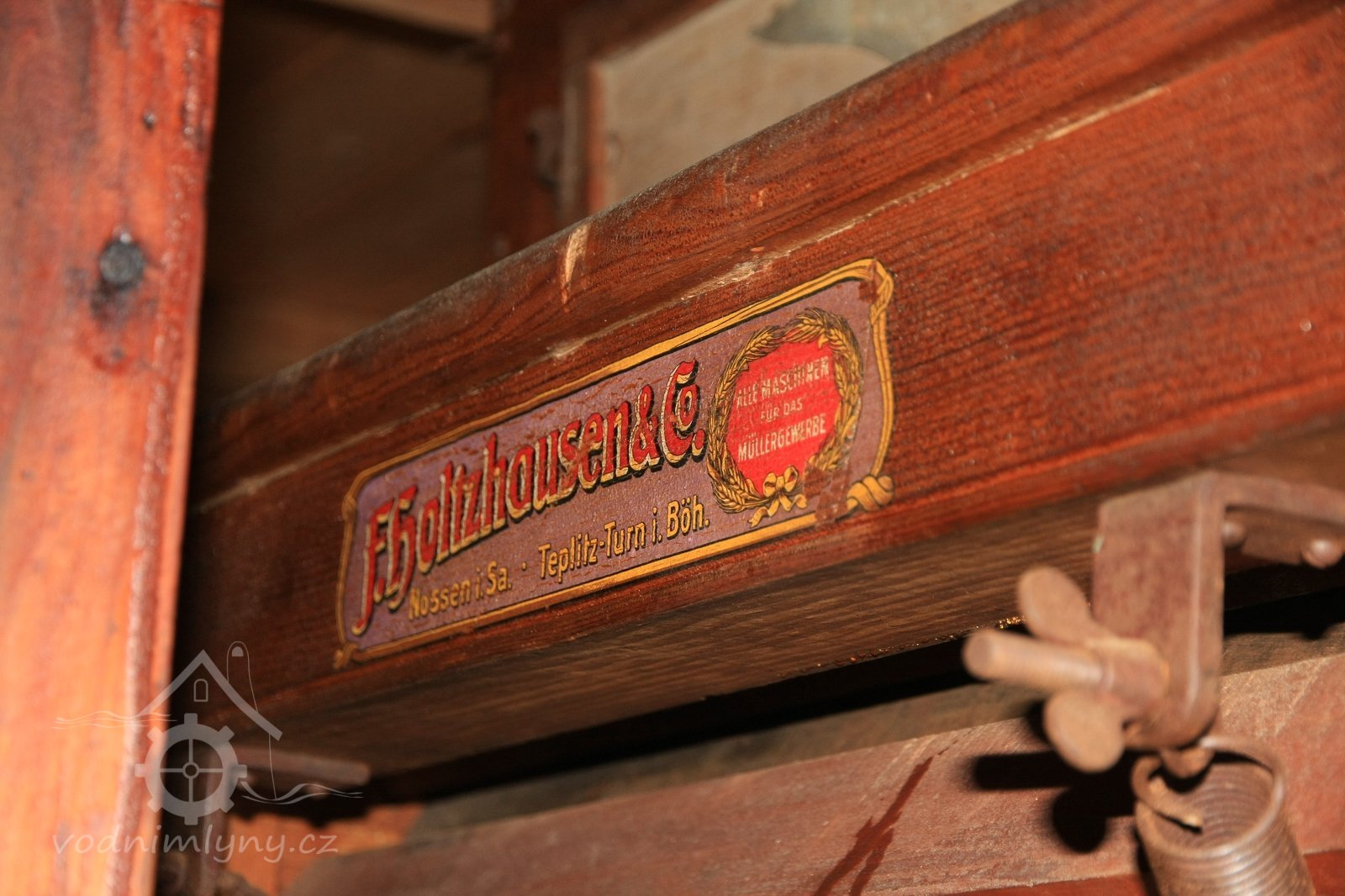 Štítek Hübner a Opitz, 2012, © Vodní mlýny na Novojičínsku, (Prvky na obrázku: značka výrobce na technologickém vybavení)