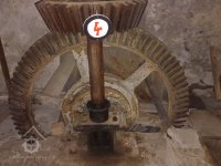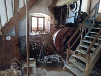 Transmise v koutě mlýna, 2013, © Šimek, (Prvky na obrázku: transmise, řemenice, převody)
