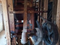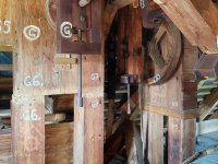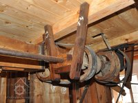transmise mezi mlýnem a stodolou k pohonu zemědělských strojů na unikátní dřevěné konstrukci, 2014, © David Veverka, (Prvky na obrázku: transmise, řemenice, převody)