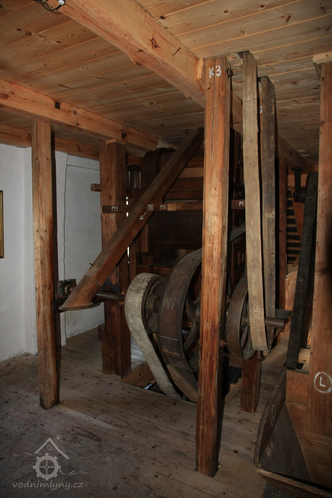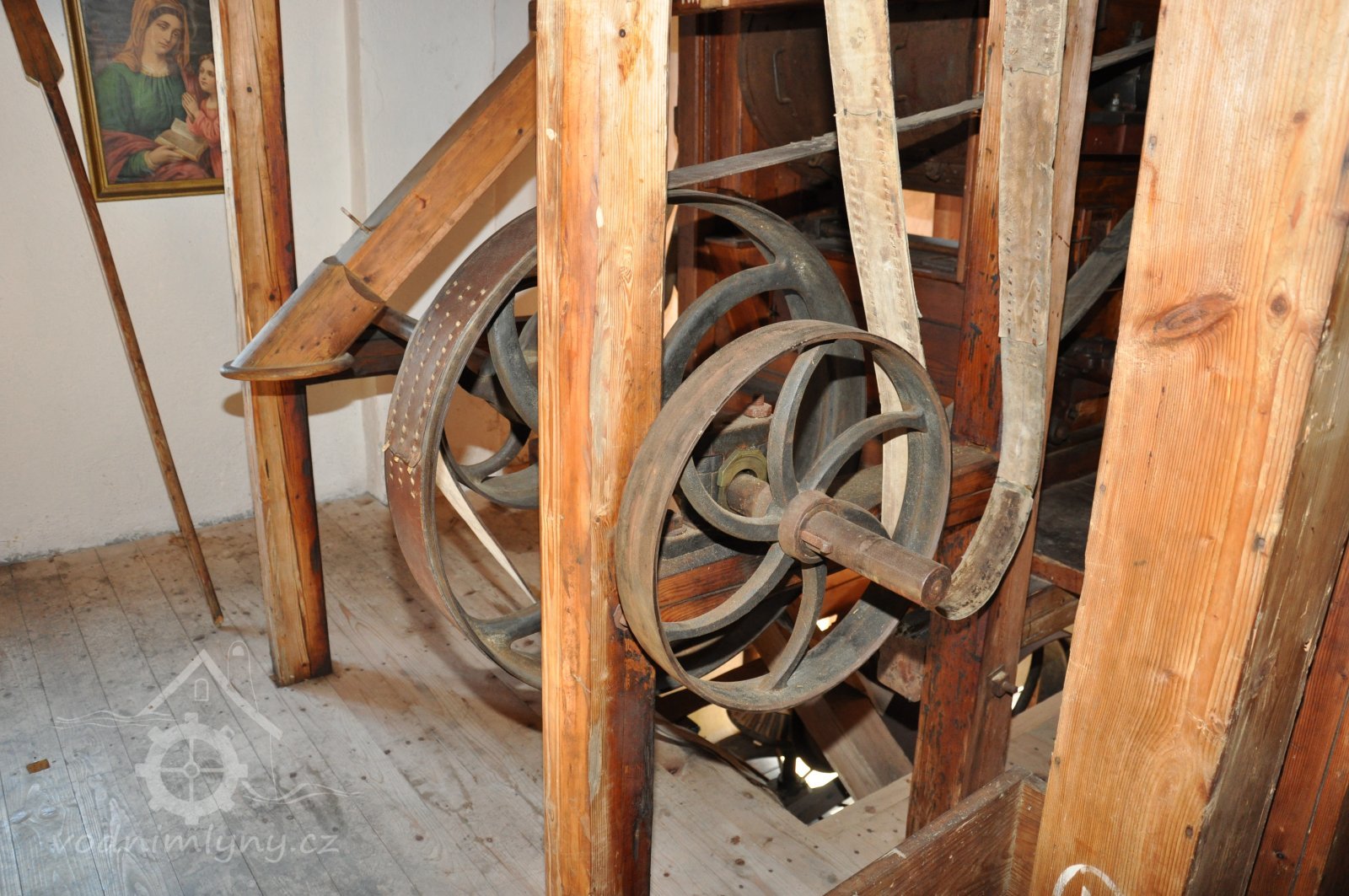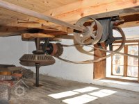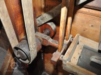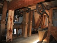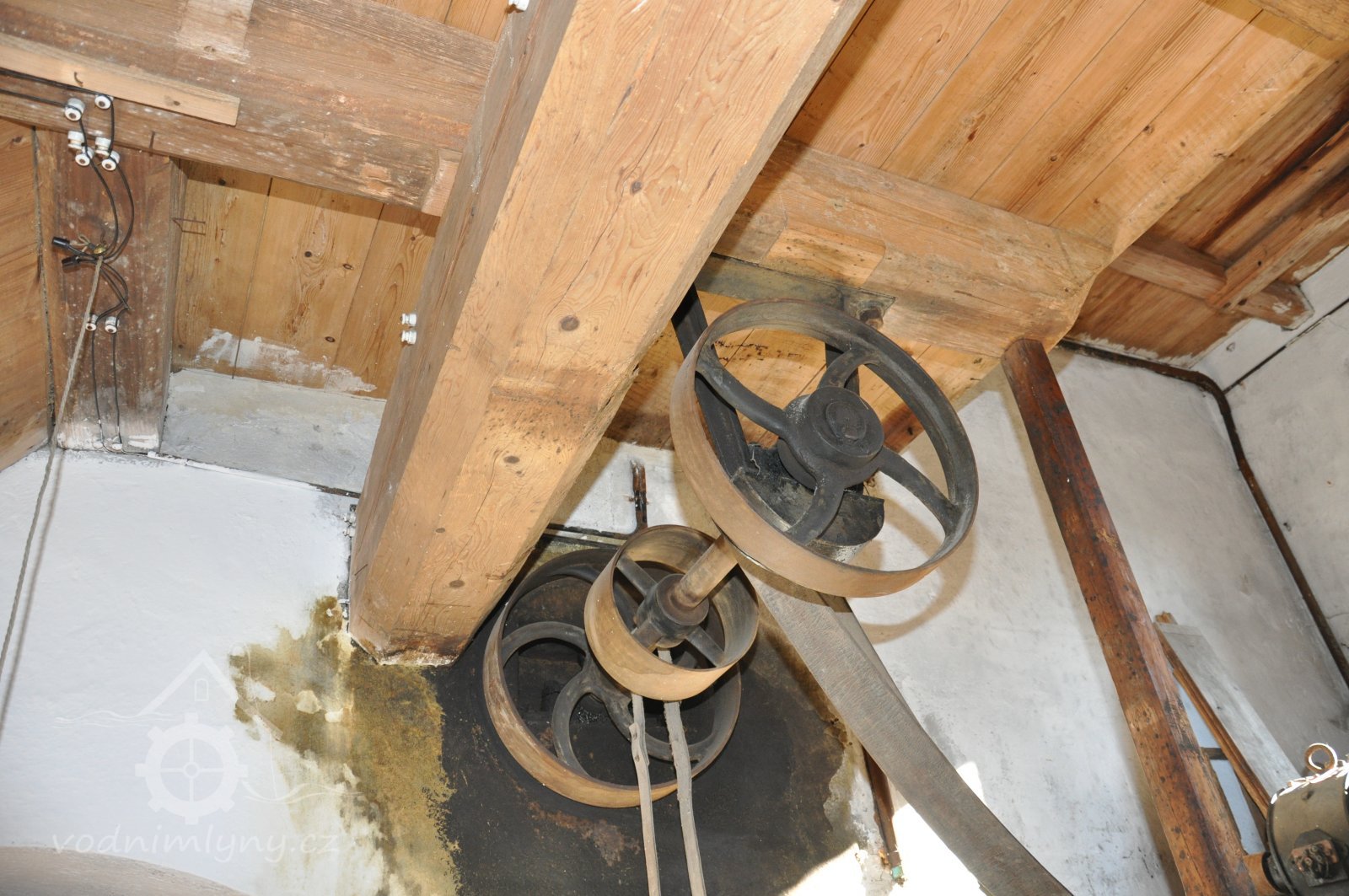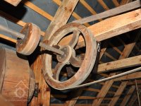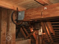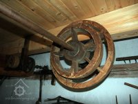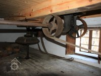 Převod z hřídele vodního kola na železí mlecího složení a královskou hřídel, 2013, © Šimek, (Prvky na obrázku: transmise, řemenice, převody)