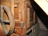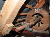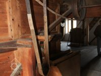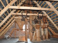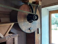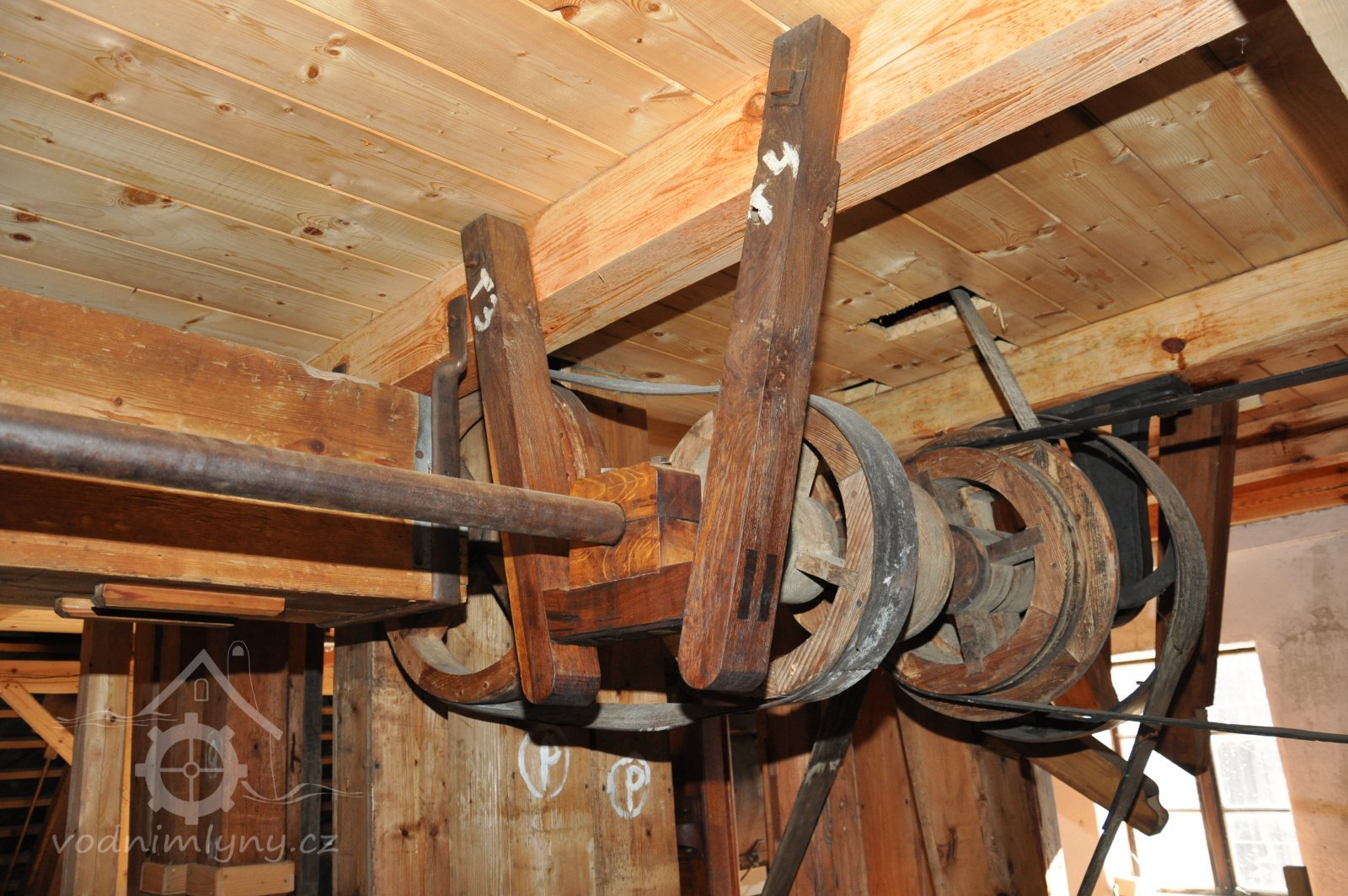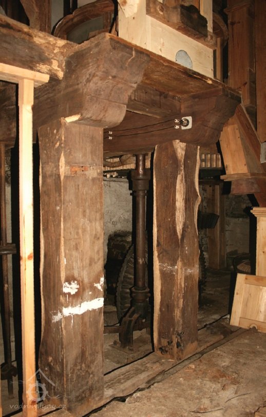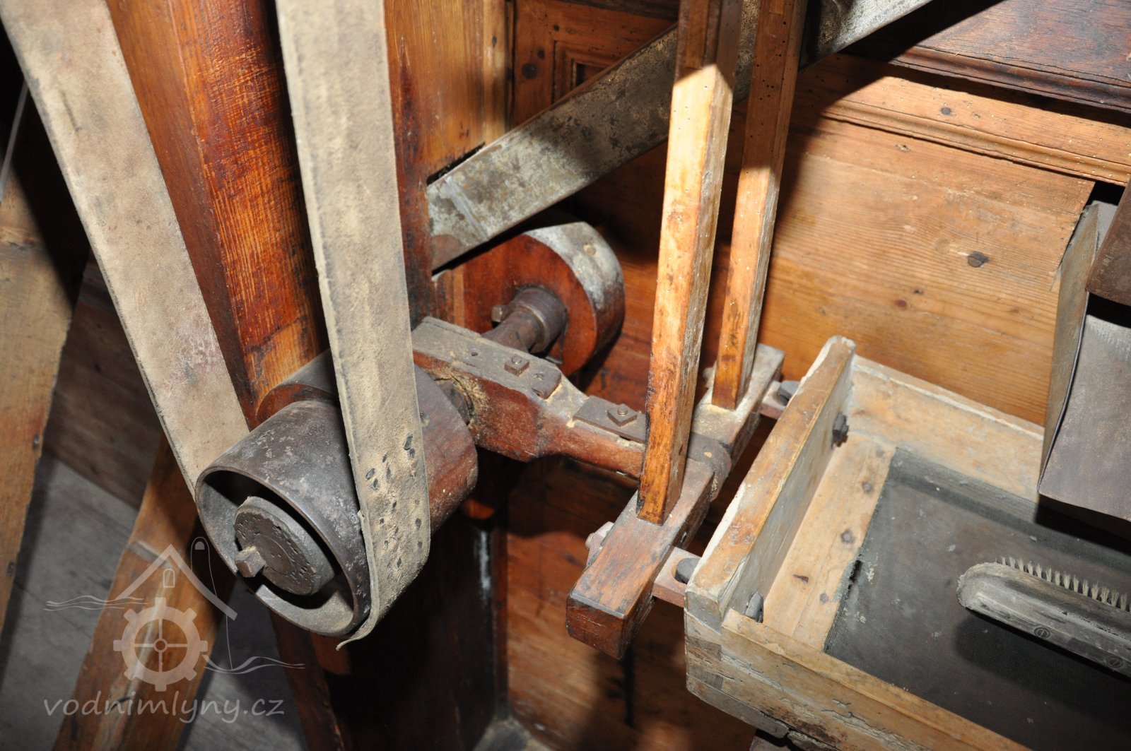 Převod z hřídele vodního kola na železí mlecího složení a královskou hřídel, 2013, © Šimek, (Prvky na obrázku: transmise, řemenice, převody)