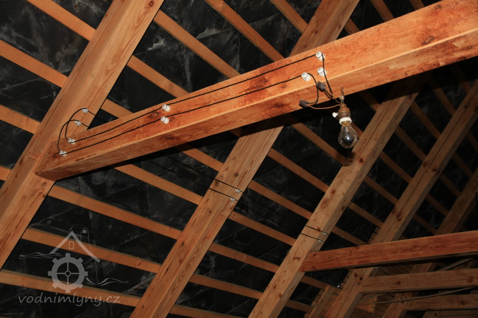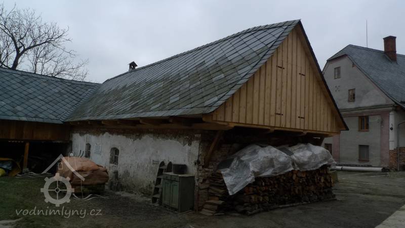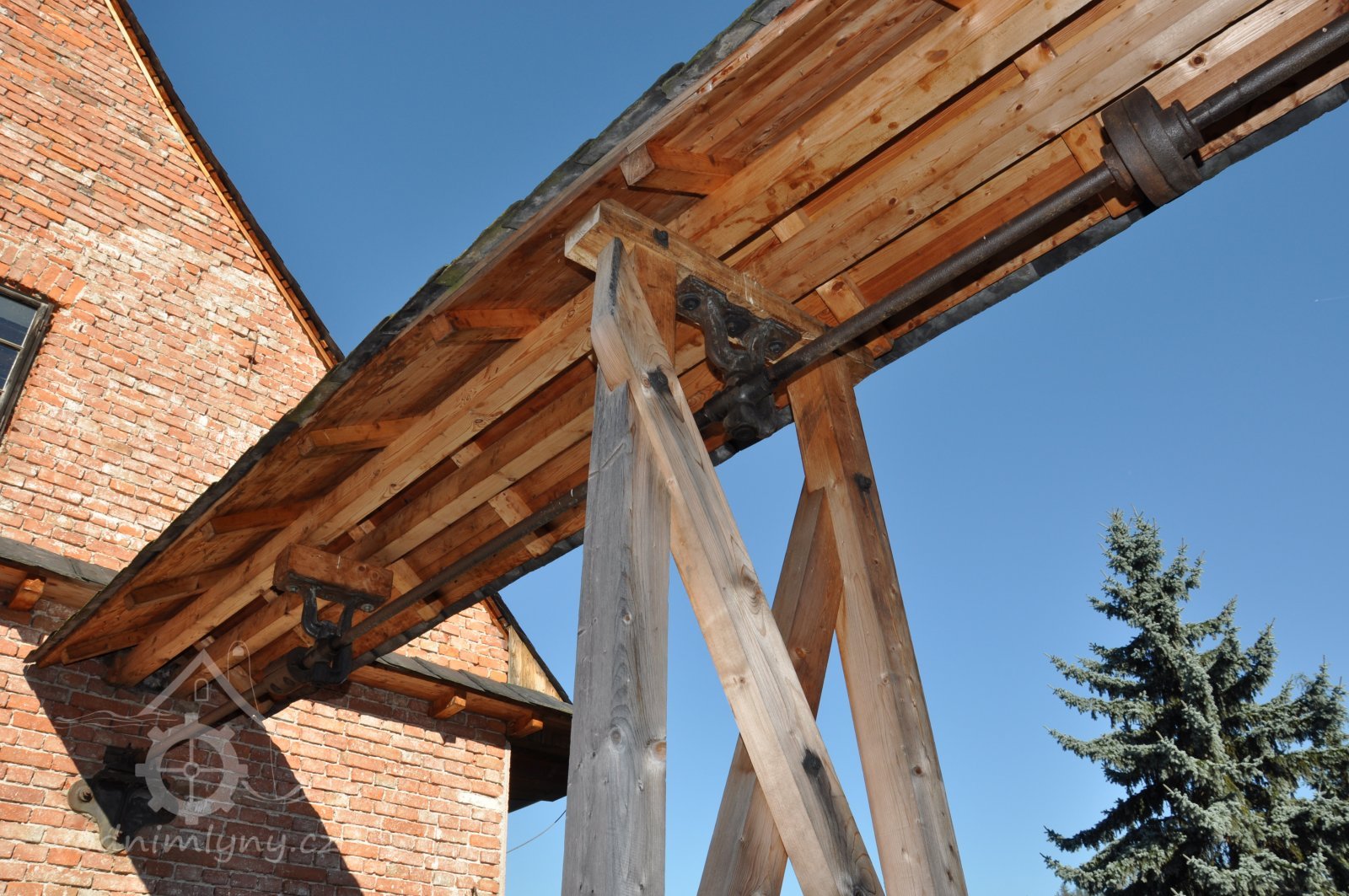 zastřešení nad transmisí vedoucí do protějšího objektu stodoly na druhém břehu náhonu po obnově, 2014, © Alena Borovcová, (Prvky na obrázku: transmise, řemenice, převody)
