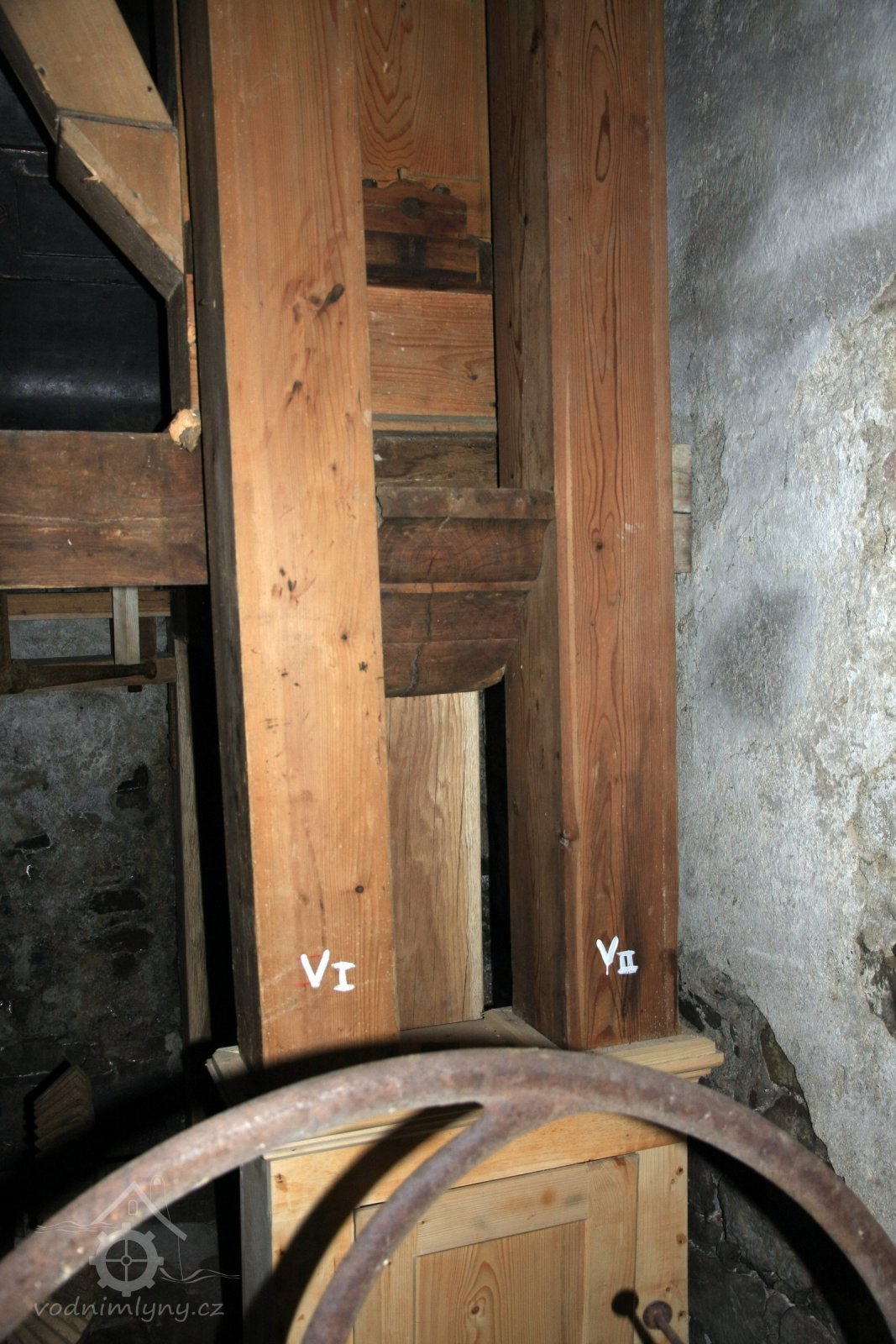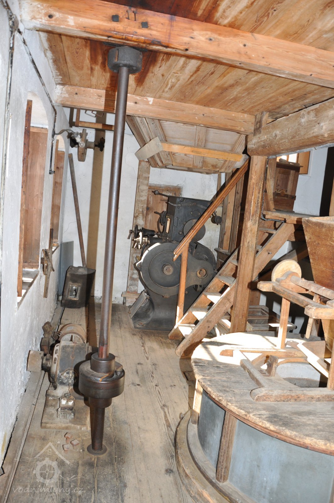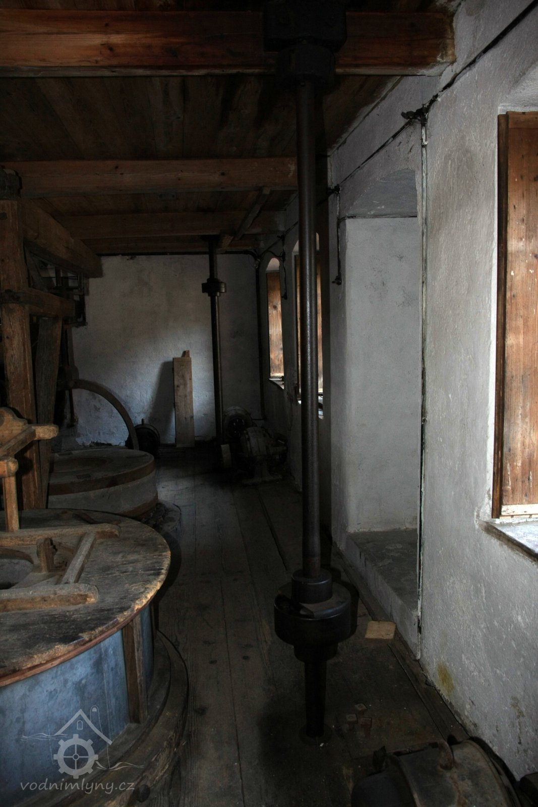 Dvě královské hřídele prostupující mlecí podlahu, 2013, © Šimek, (Prvky na obrázku: transmise, řemenice, převody, kamenné složení (šrotovací, mlecí))