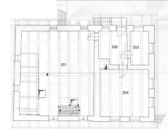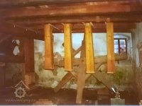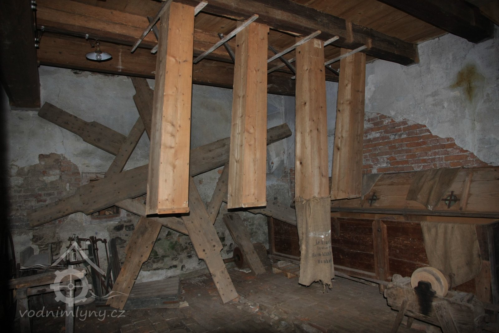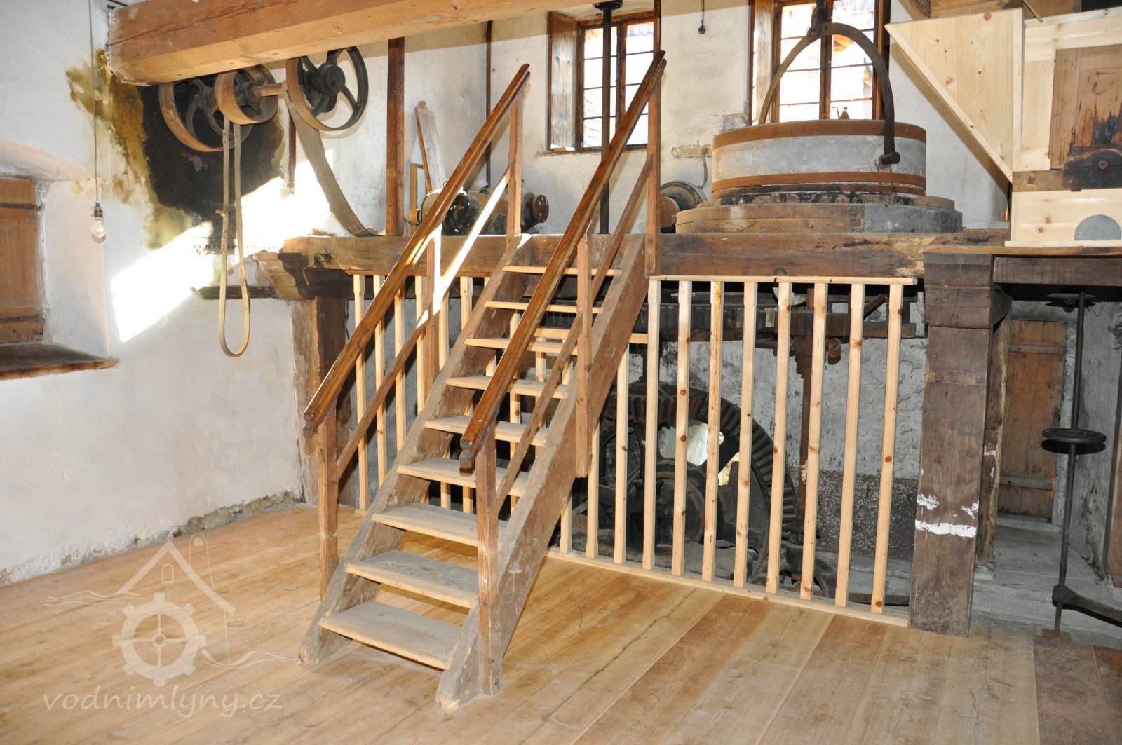 Dvě královské hřídele prostupující mlecí podlahu, 2013, © Šimek, (Prvky na obrázku: transmise, řemenice, převody, kamenné složení (šrotovací, mlecí))