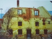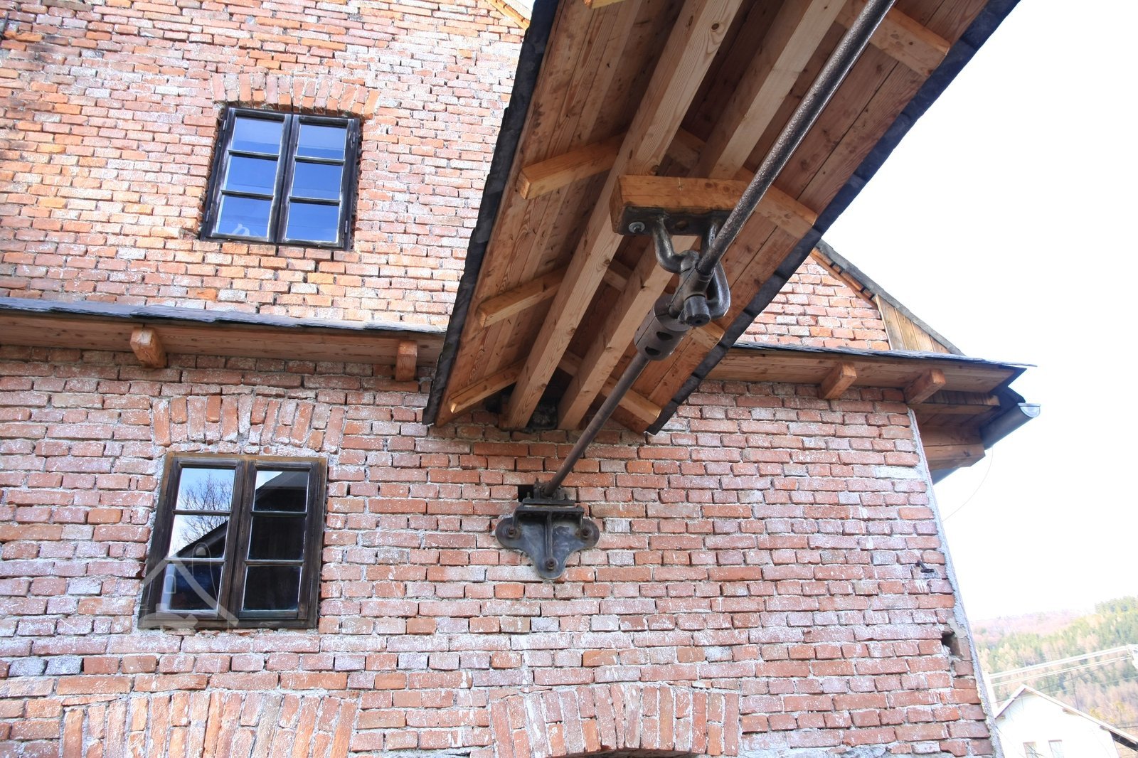 štítová stěna s transmisí vedoucí do protějšího objektu stodoly na druhém břehu náhonu před obnovou., 2003, © Alena Borovcová, (Prvky na obrázku: transmise, řemenice, převody)