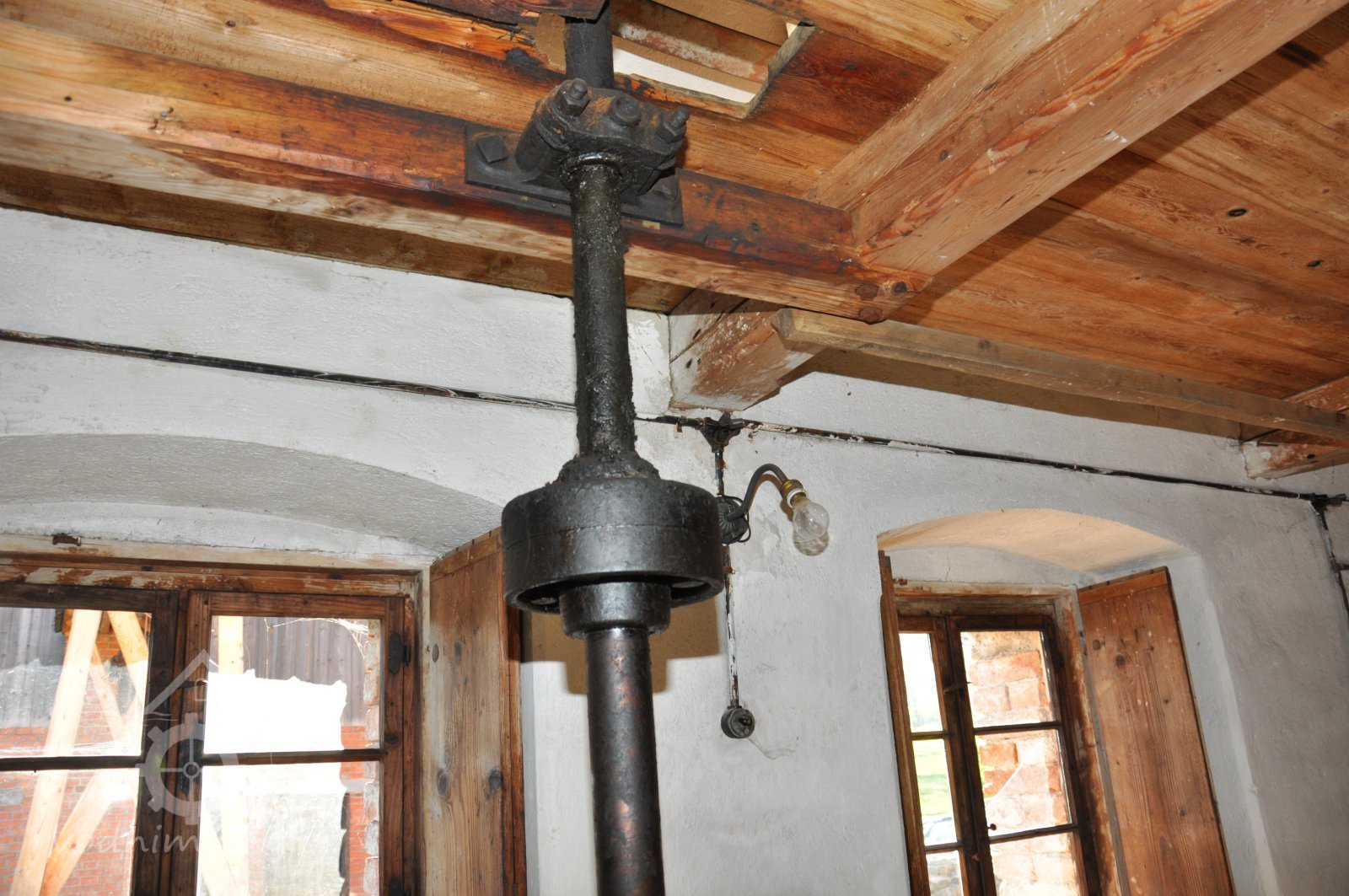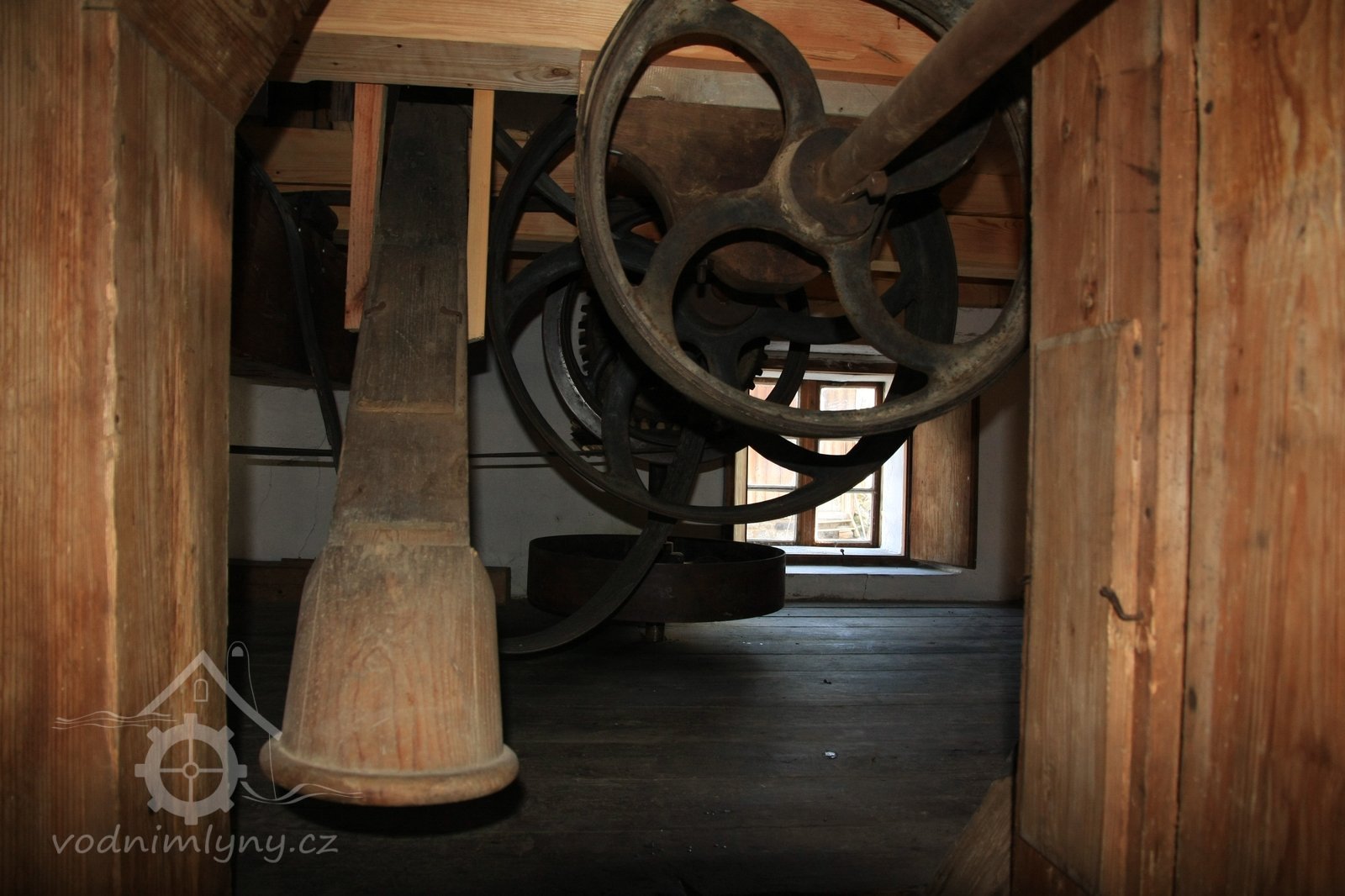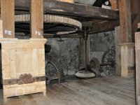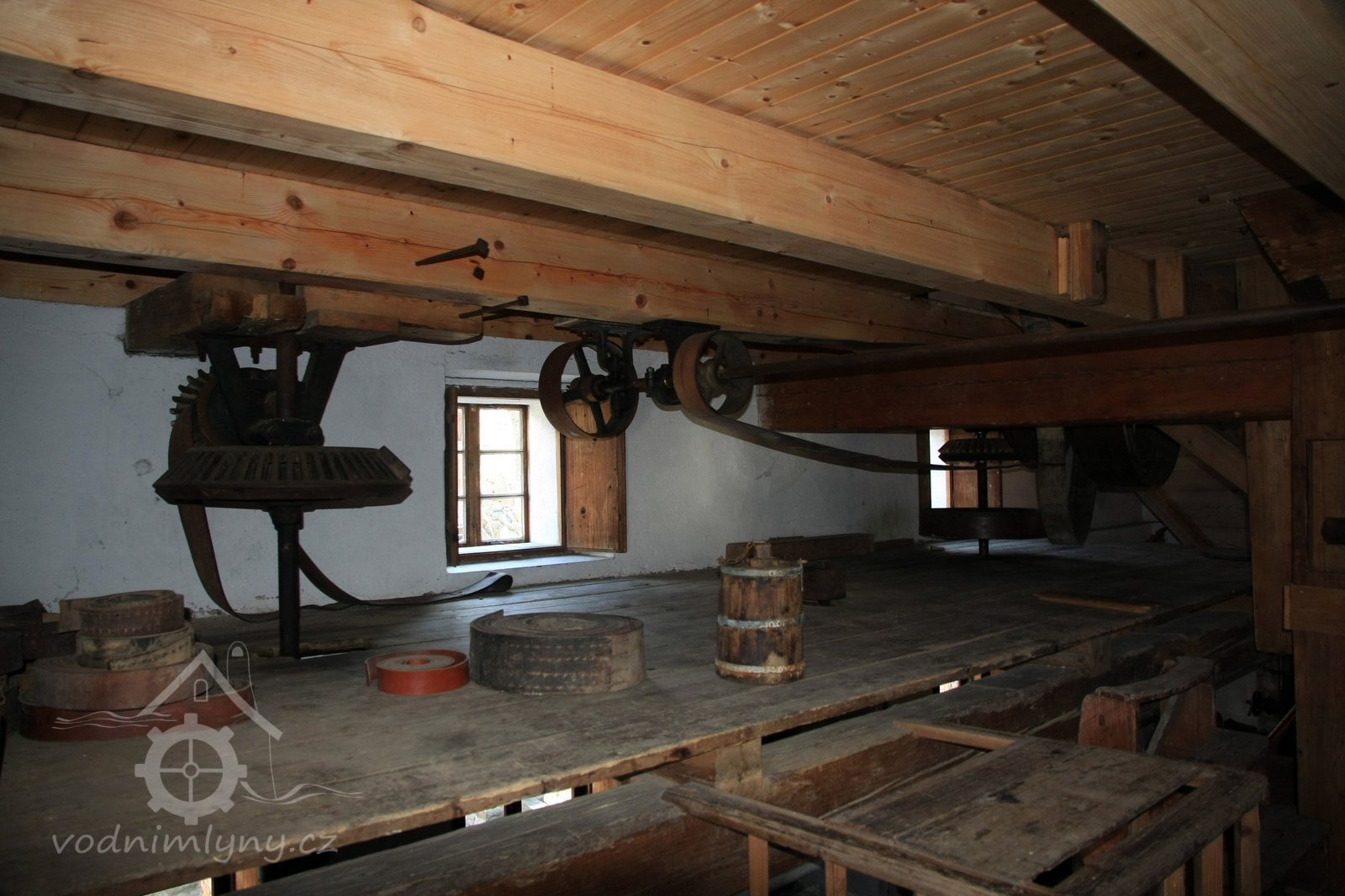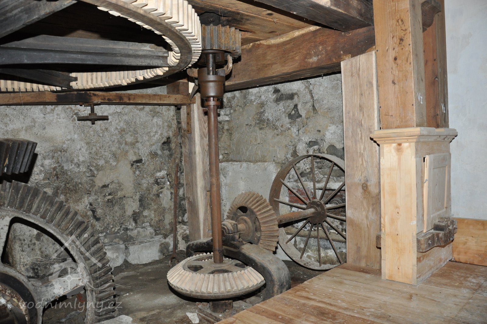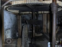 Pohled do podkolí uměleckého mlýna, 2013, © Šimek, (Prvky na obrázku: transmise, řemenice, převody)