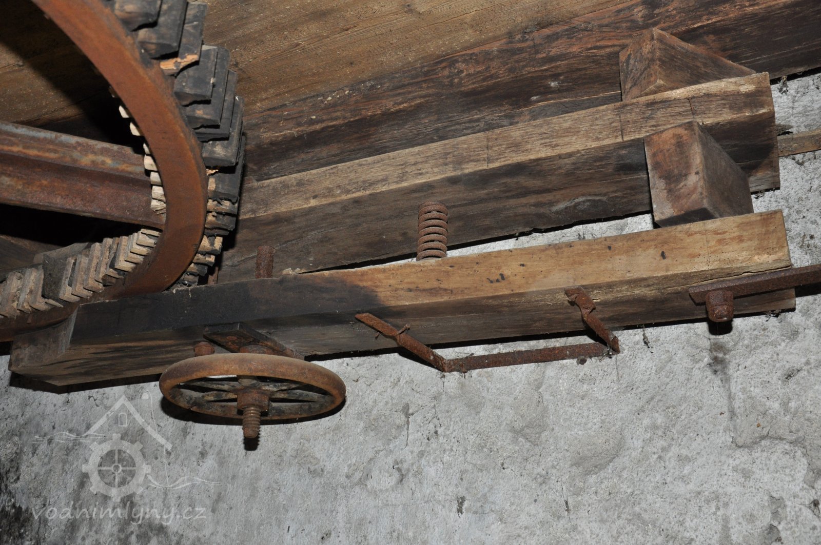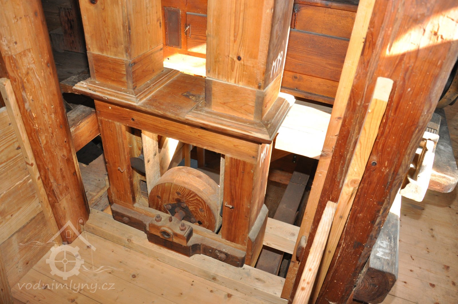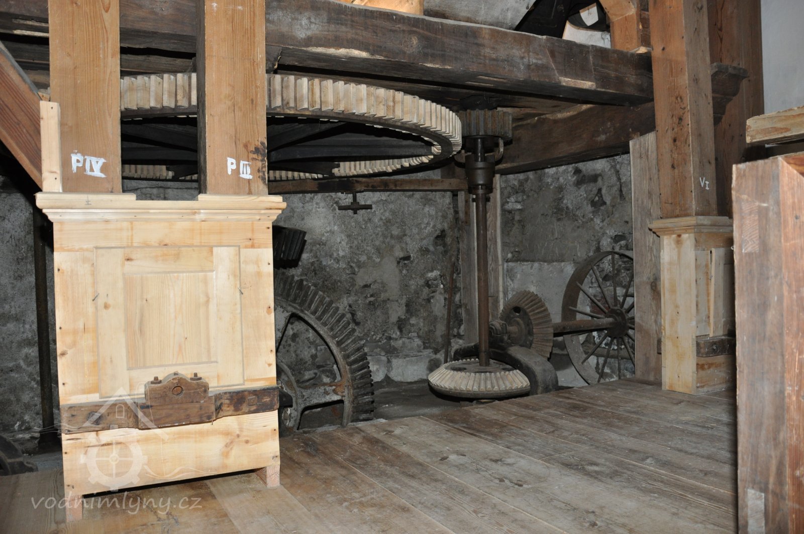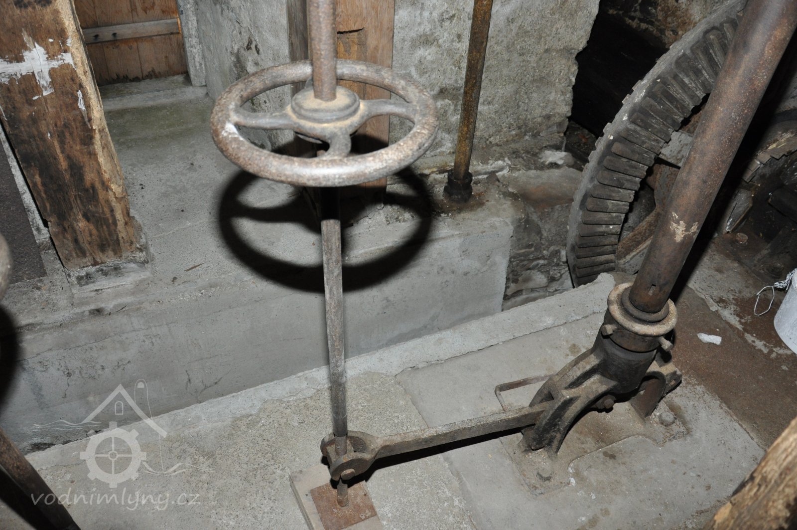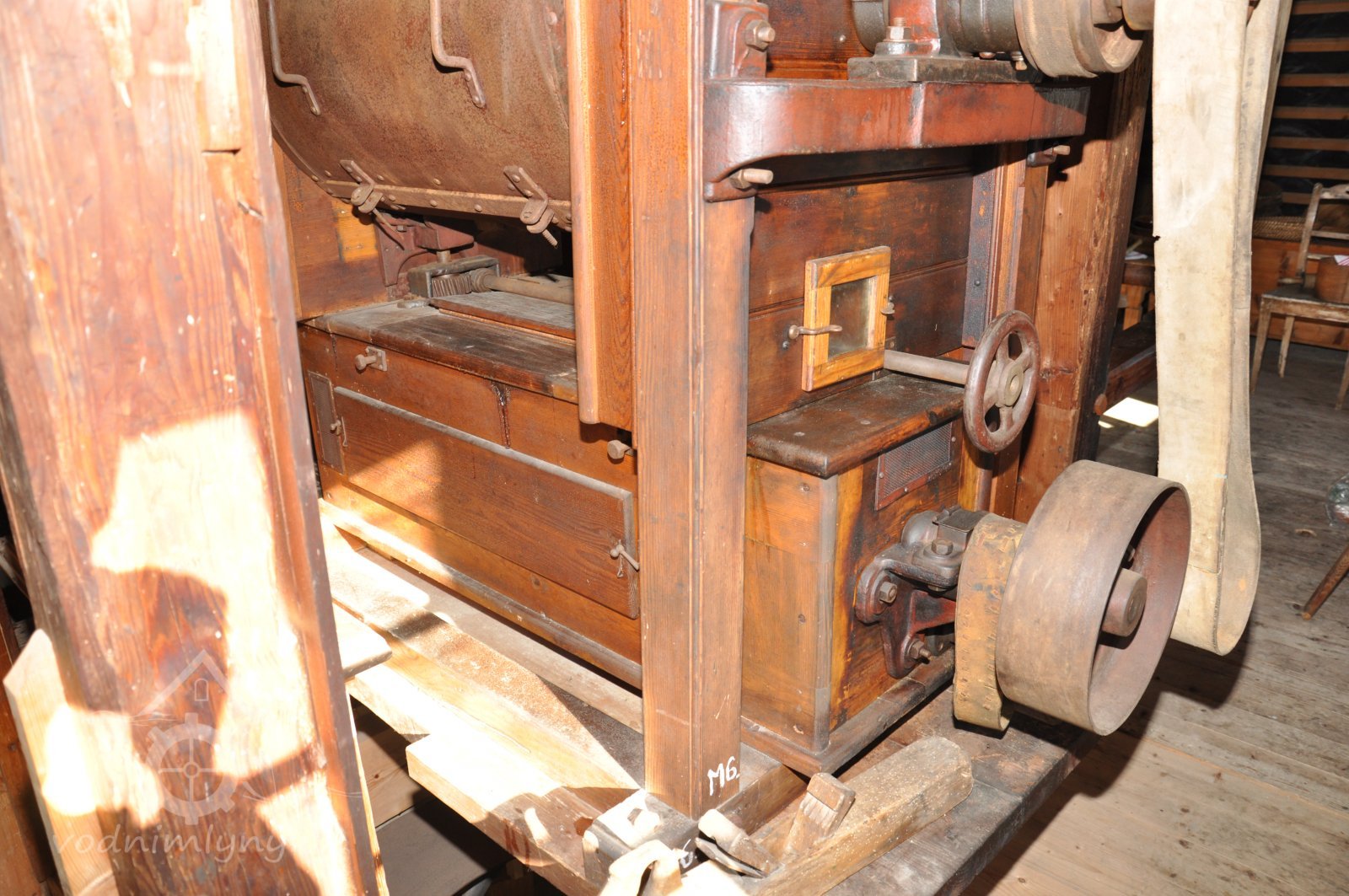 Pohled do podkolí uměleckého mlýna, 2013, © Šimek, (Prvky na obrázku: transmise, řemenice, převody)
