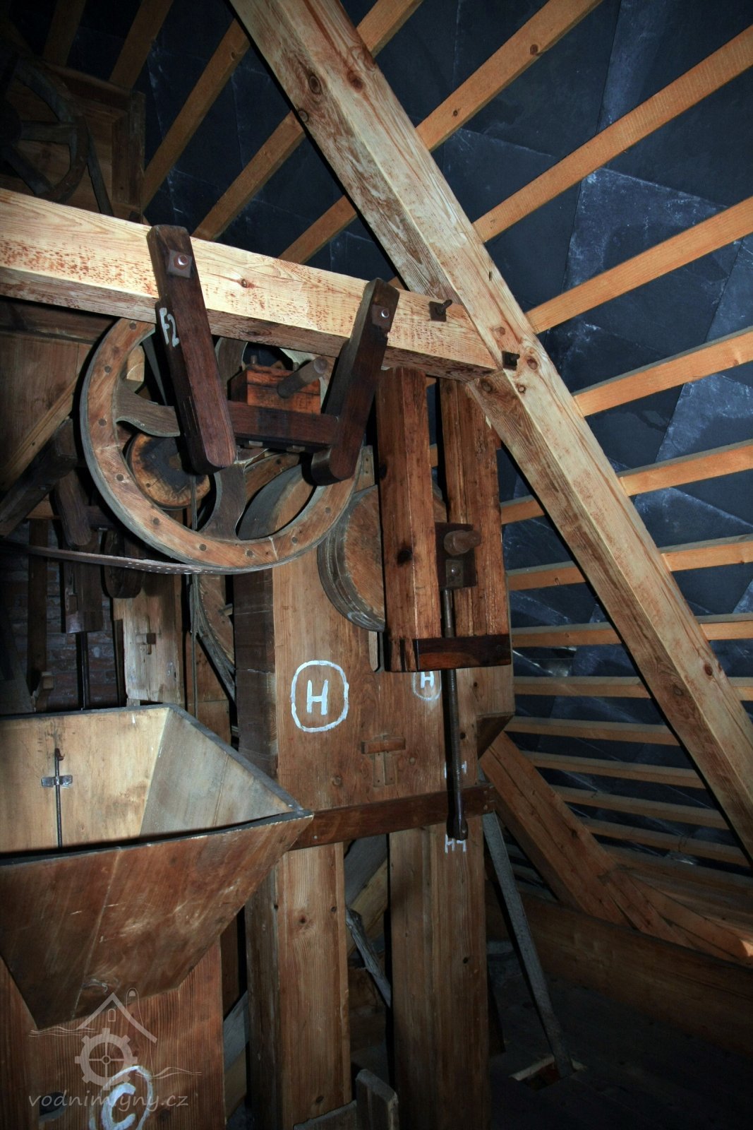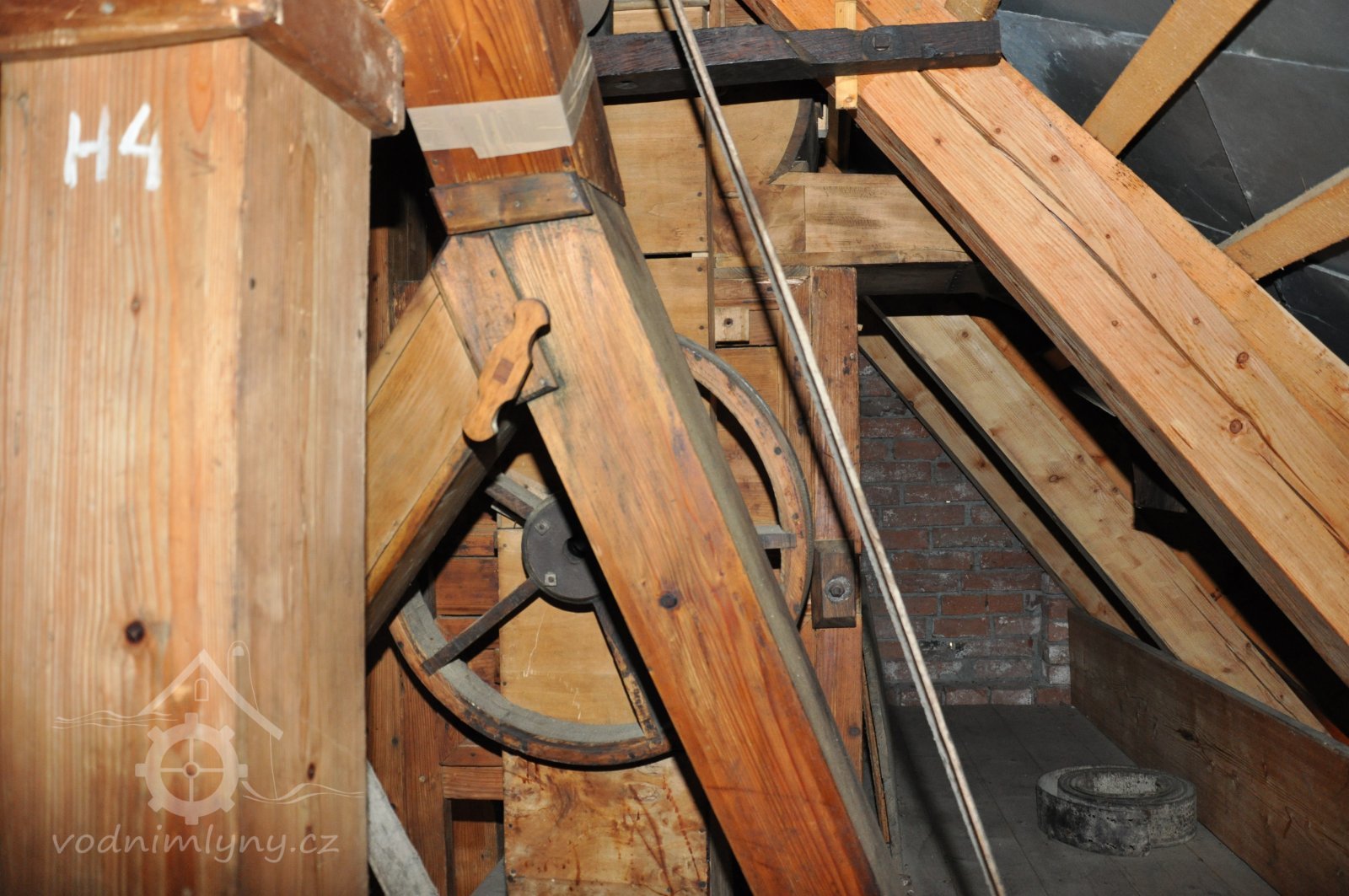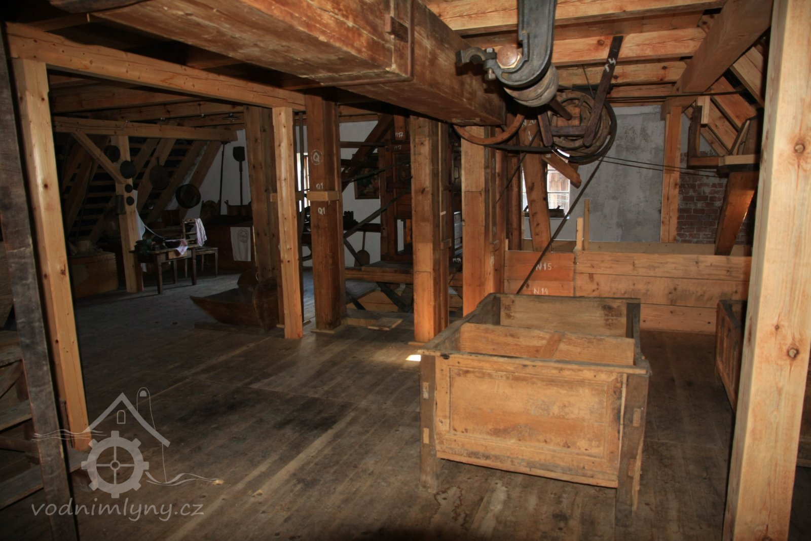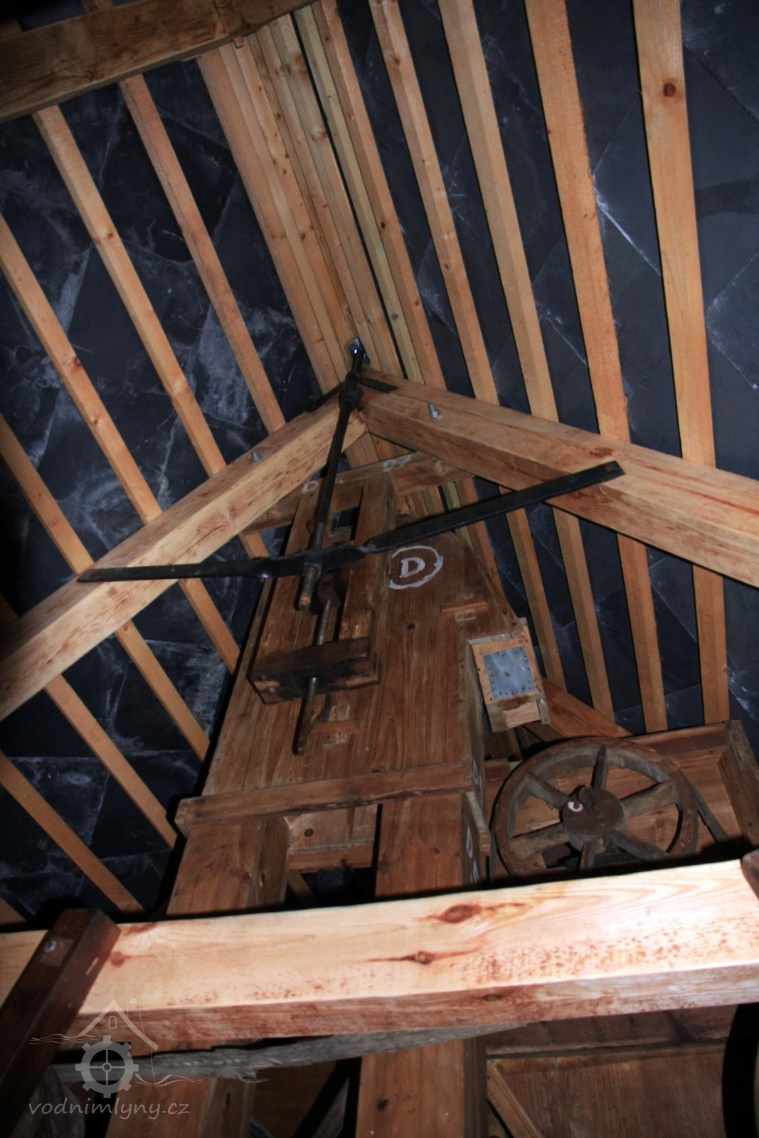 Pohled do podkolí uměleckého mlýna, 2013, © Šimek, (Prvky na obrázku: transmise, řemenice, převody)