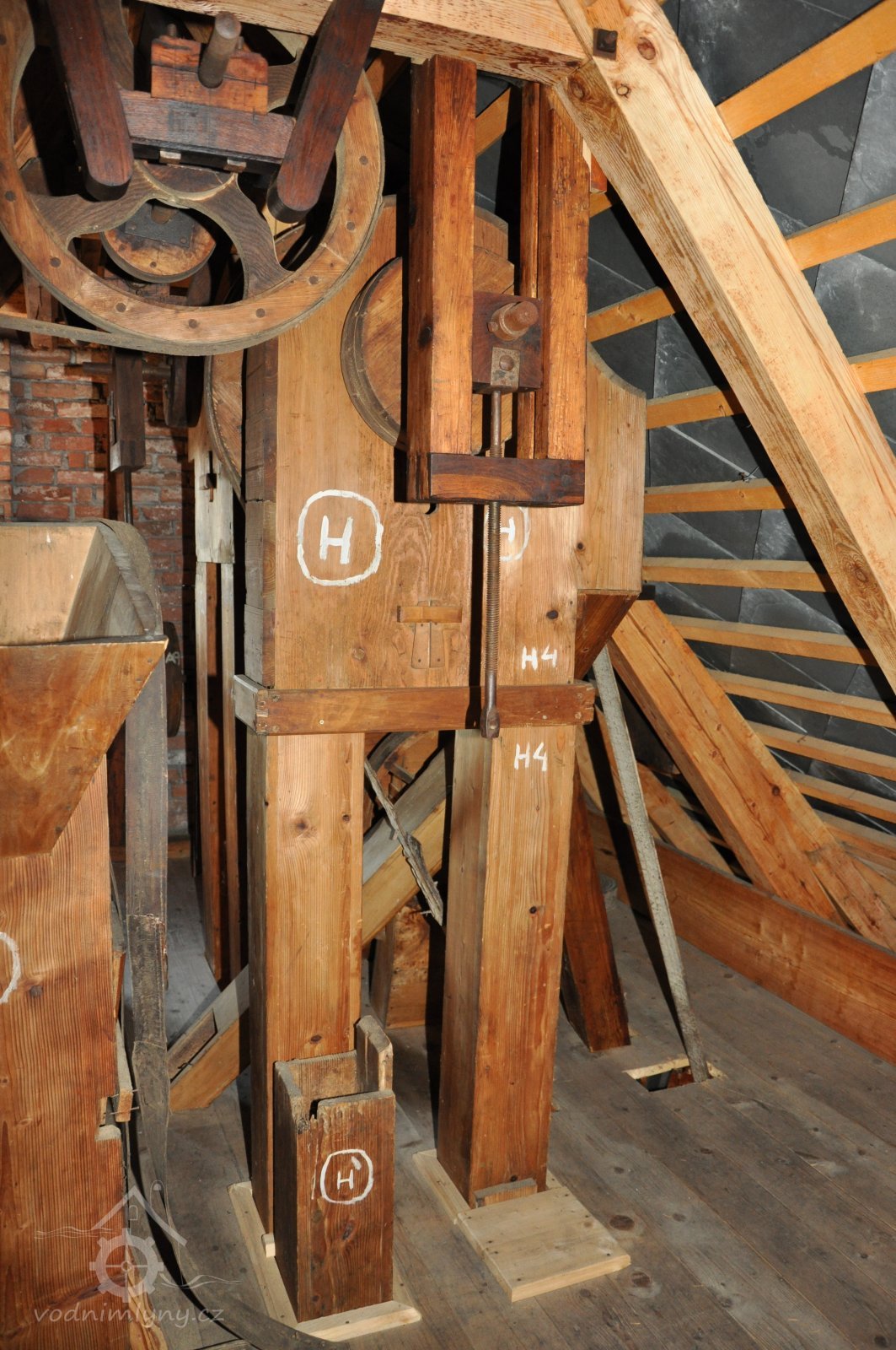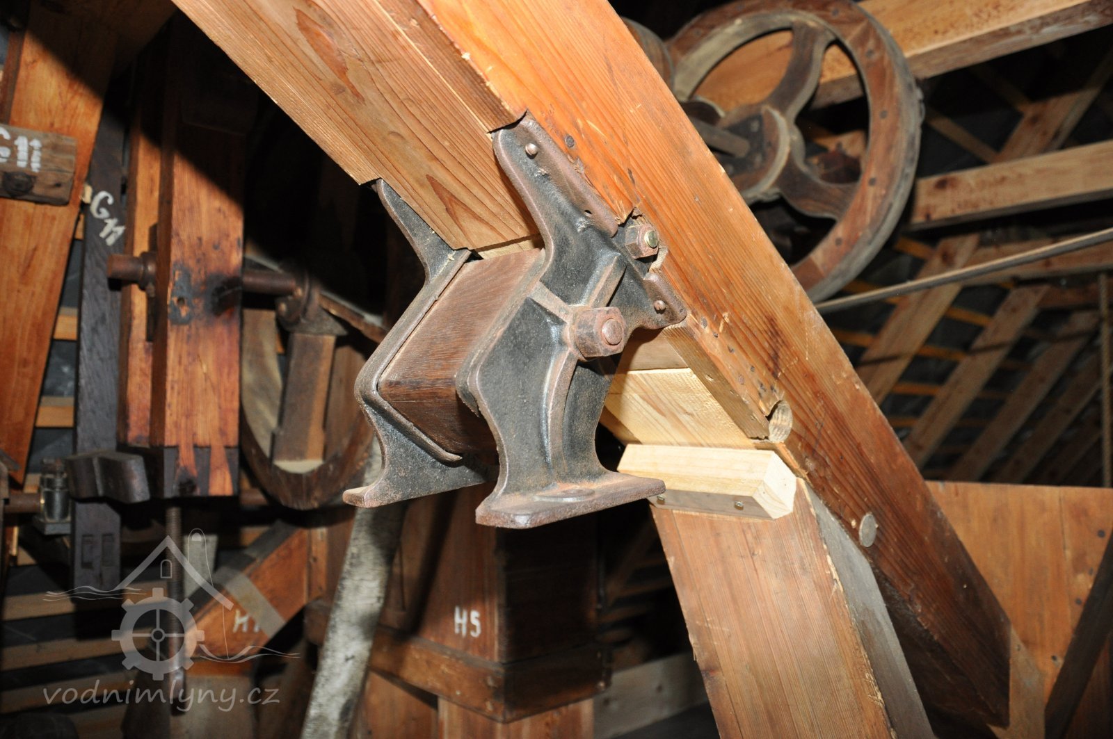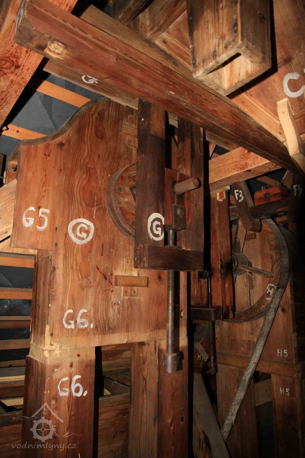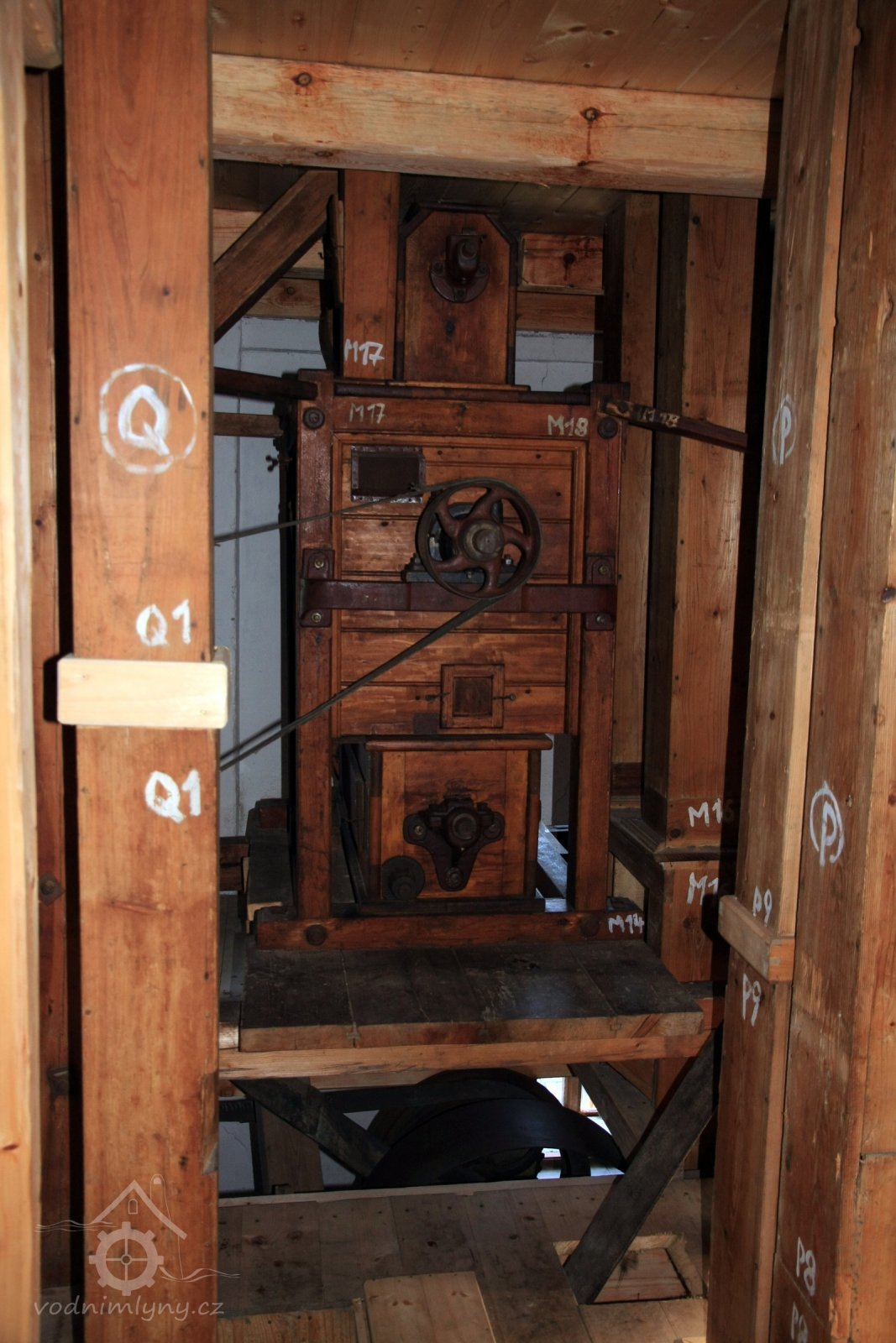 Pohled do podkolí uměleckého mlýna, 2013, © Šimek, (Prvky na obrázku: transmise, řemenice, převody)