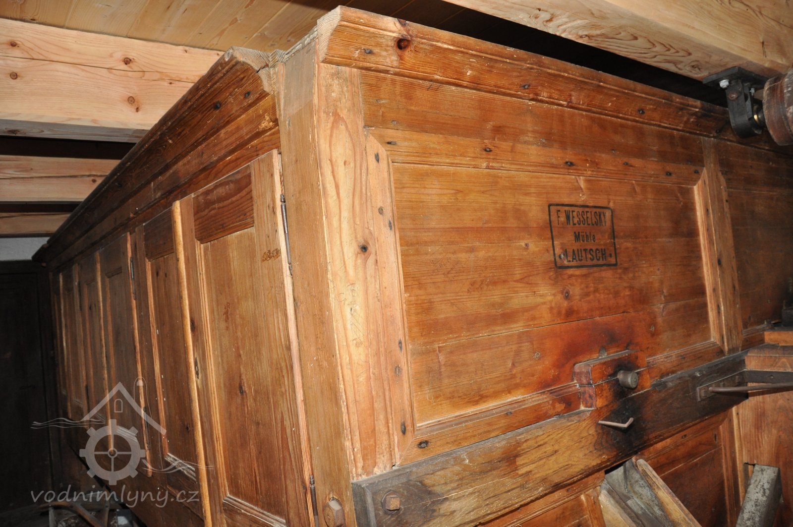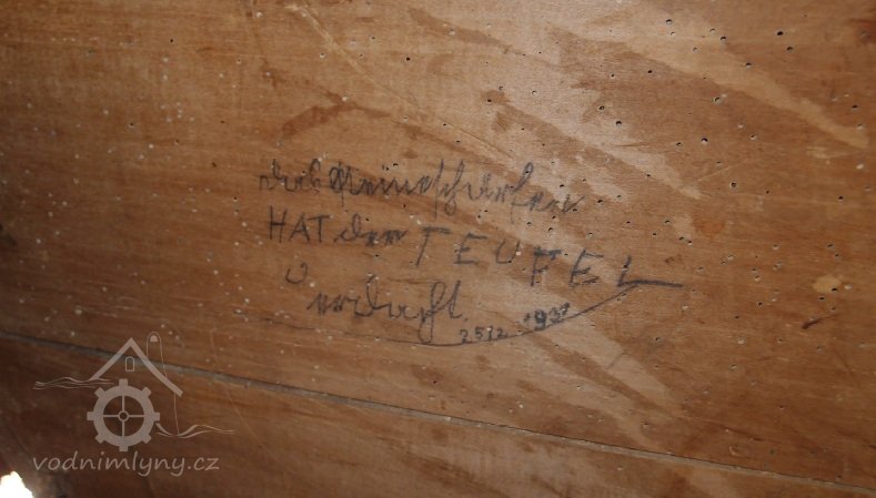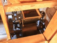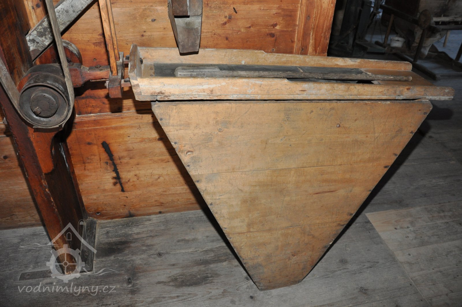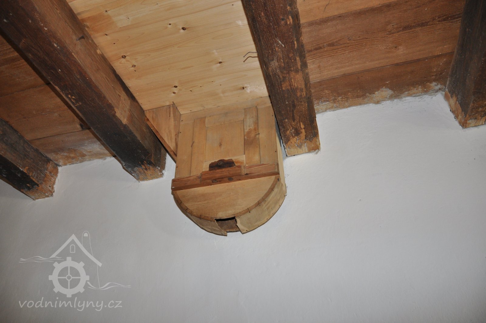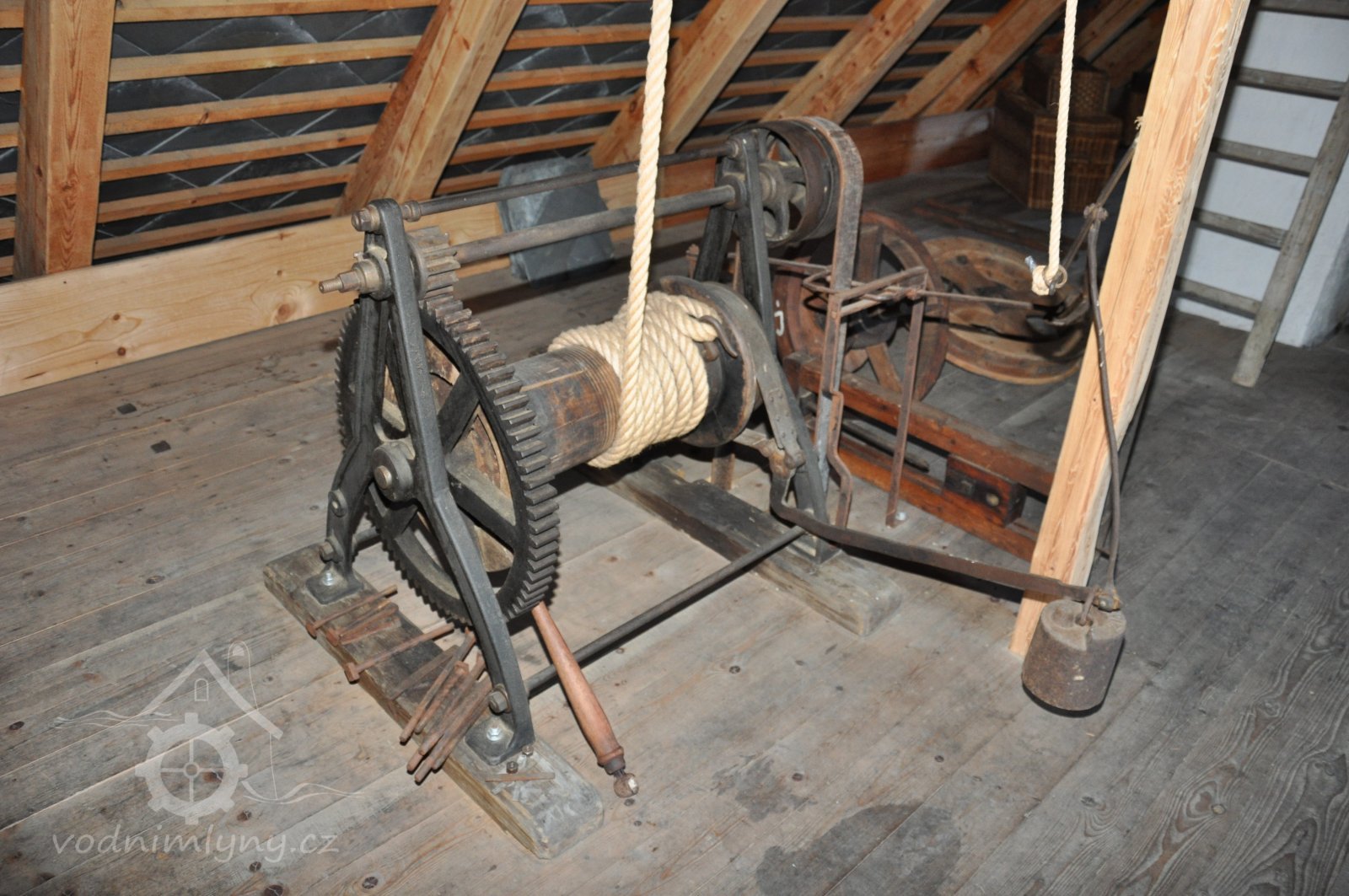 Pohled do podkolí uměleckého mlýna, 2013, © Šimek, (Prvky na obrázku: transmise, řemenice, převody)