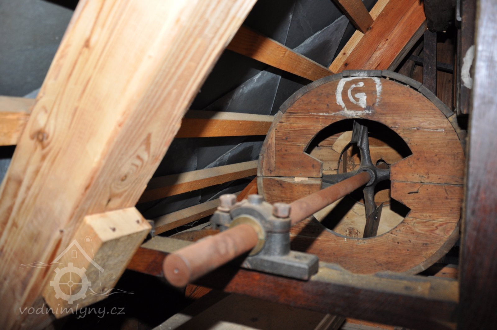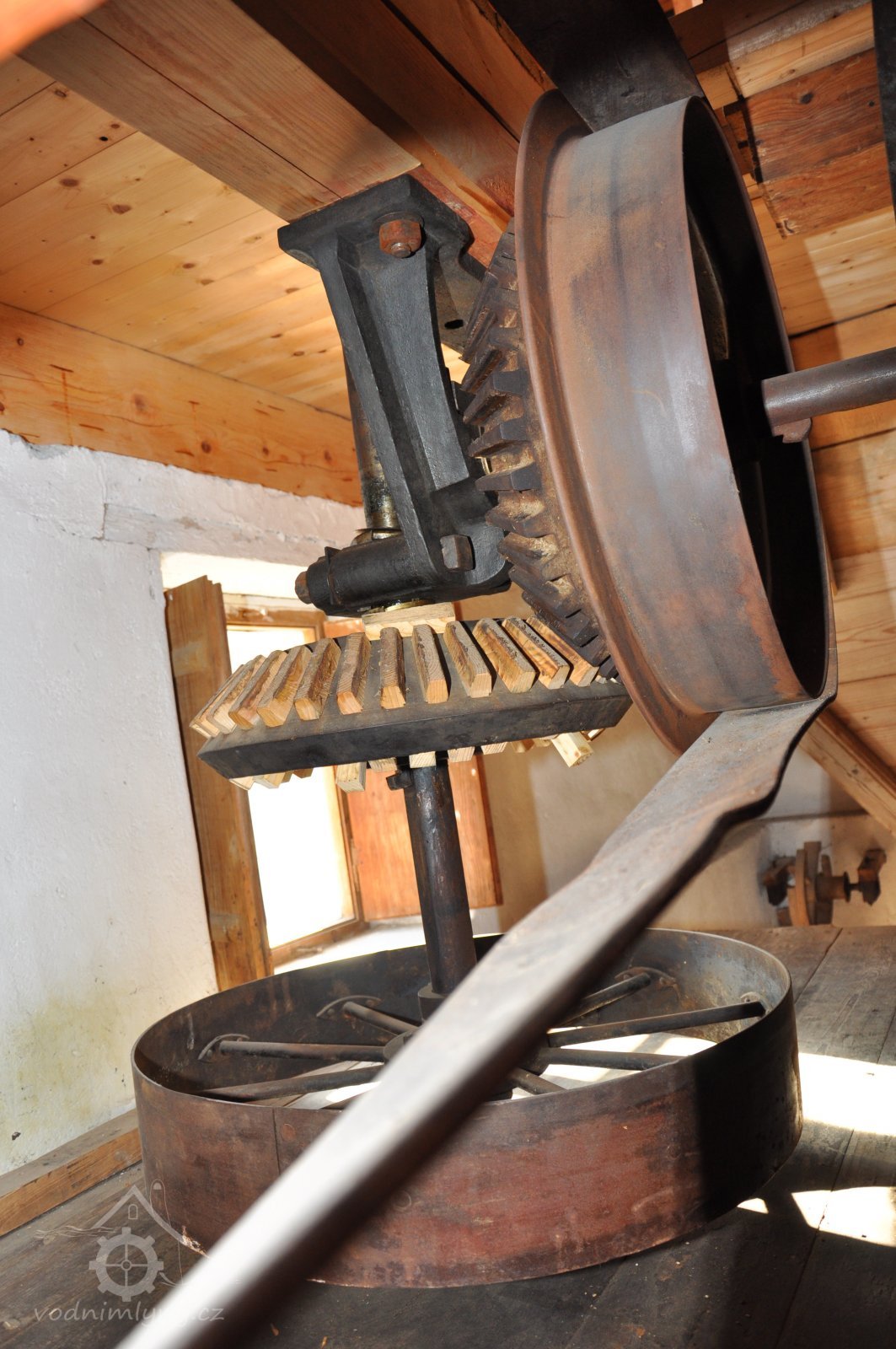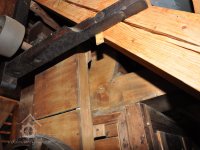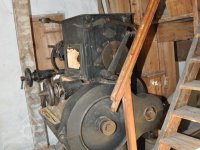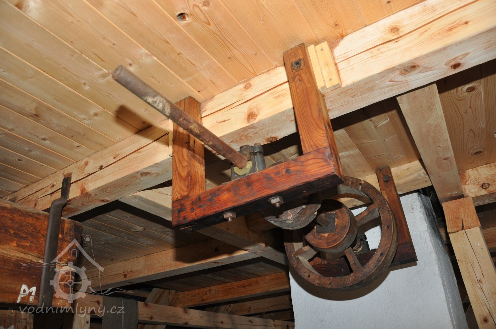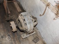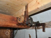Pravoúhlý převod z hřídele vodního kola na svislou transmisi, 2013, © Šimek, (Prvky na obrázku: transmise, řemenice, převody)