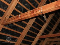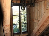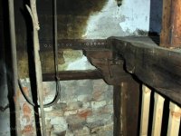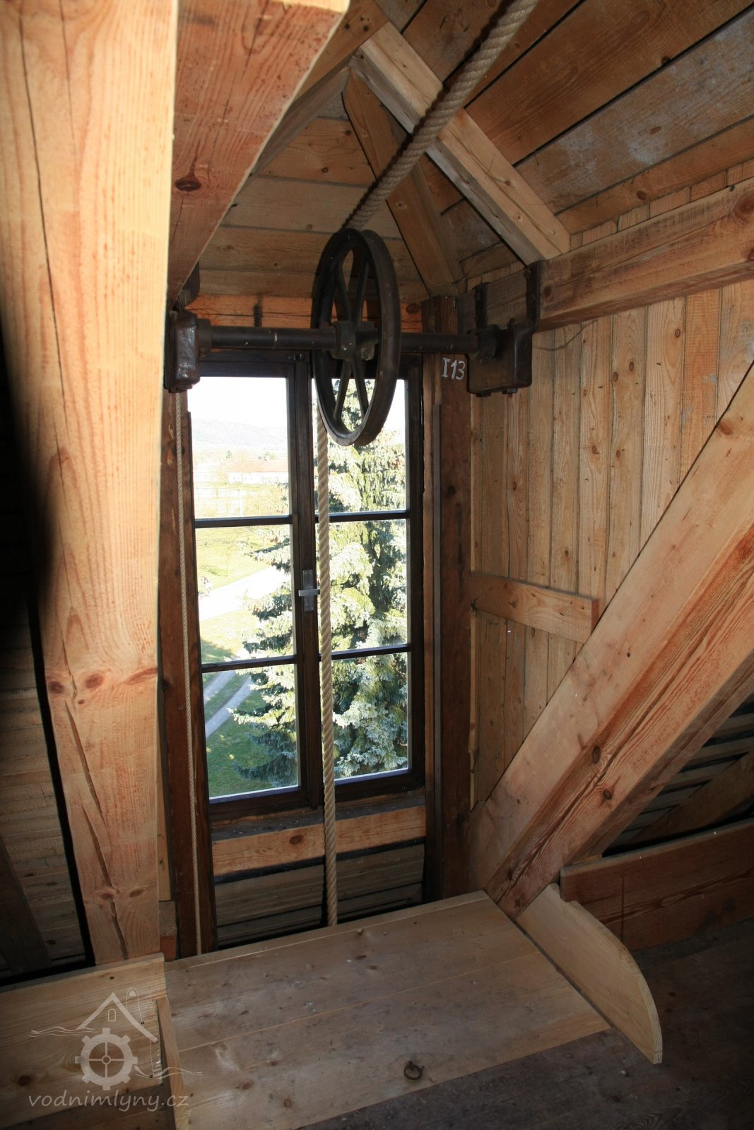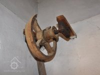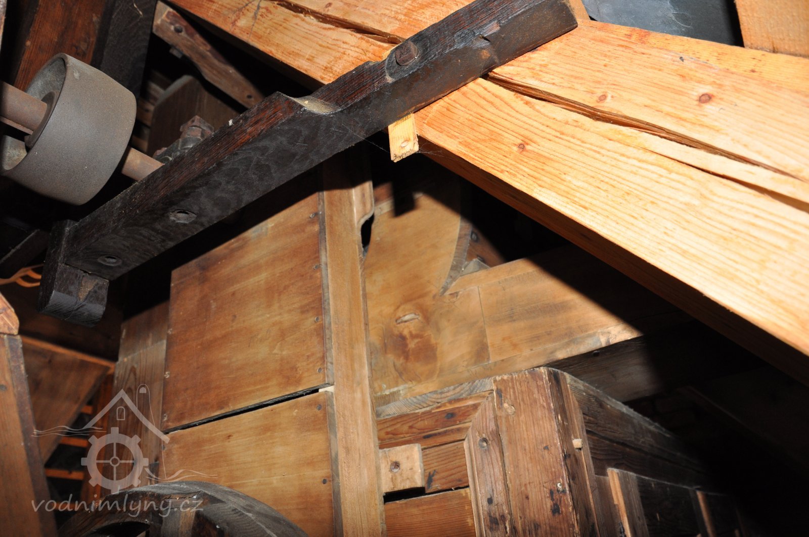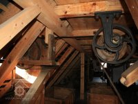 Pravoúhlý převod z hřídele vodního kola na svislou transmisi, 2013, © Šimek, (Prvky na obrázku: transmise, řemenice, převody)