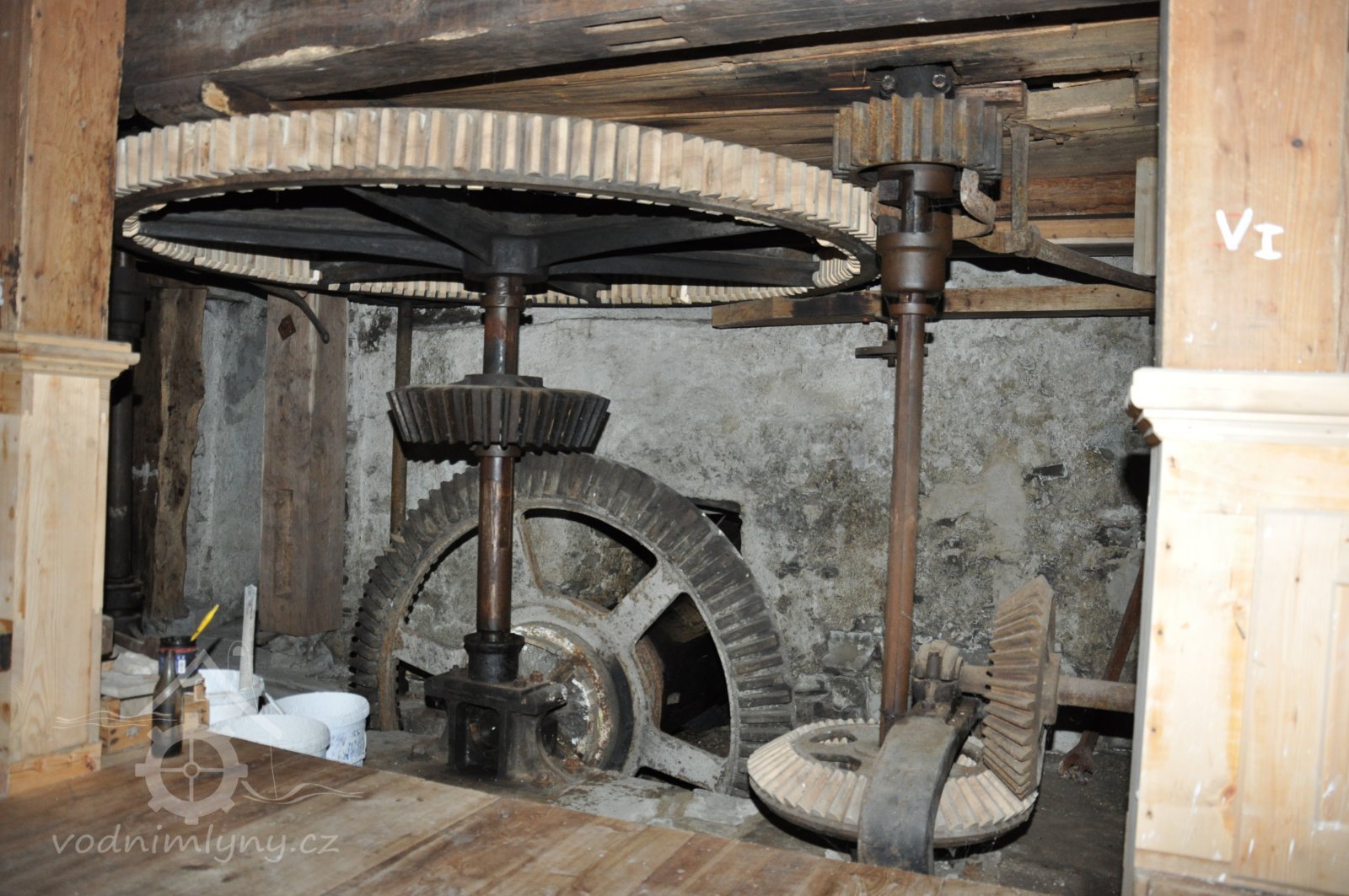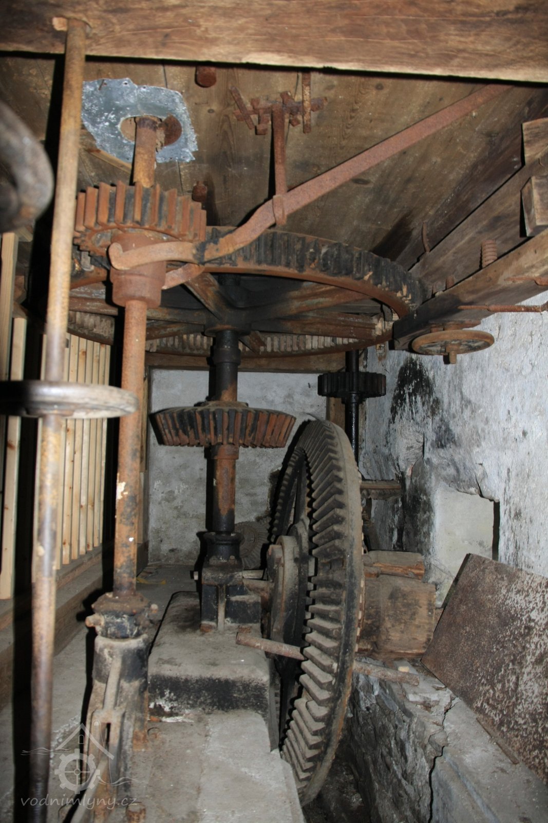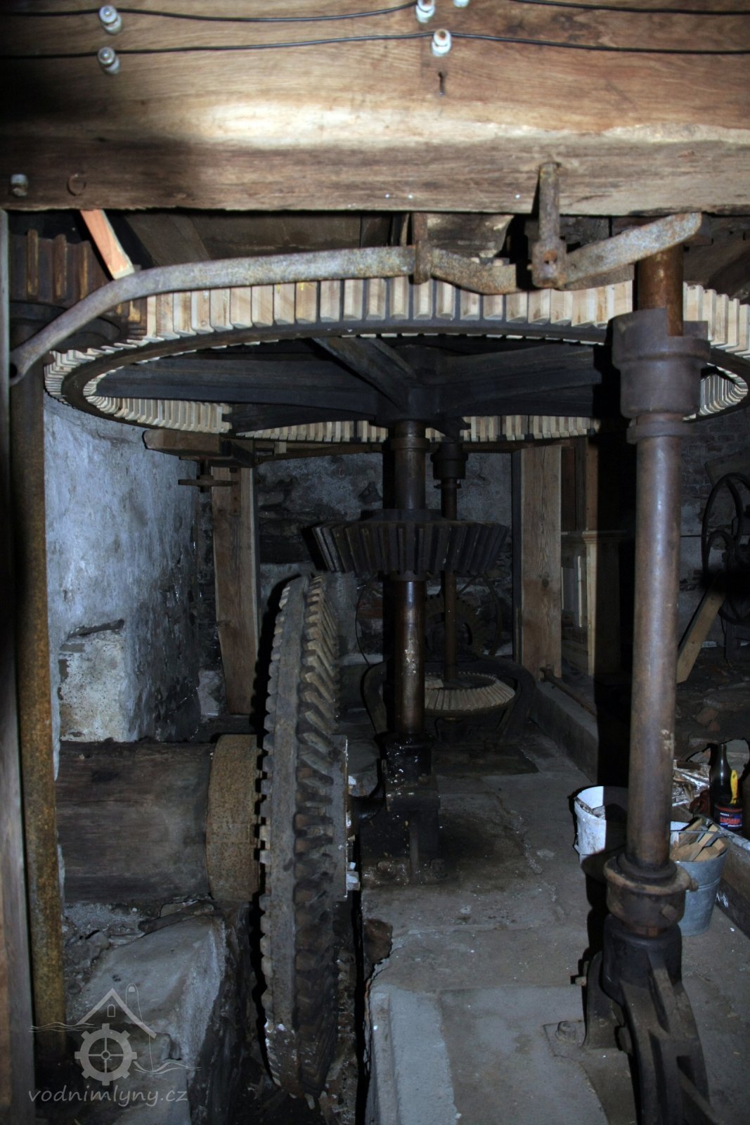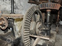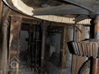 paleční převody a soukolí od 1. vodního kola a pata jednoho z kapsových dopravníků, 2014, © David Veverka, (Prvky na obrázku: transmise, řemenice, převody, výtahy a dopravníky)