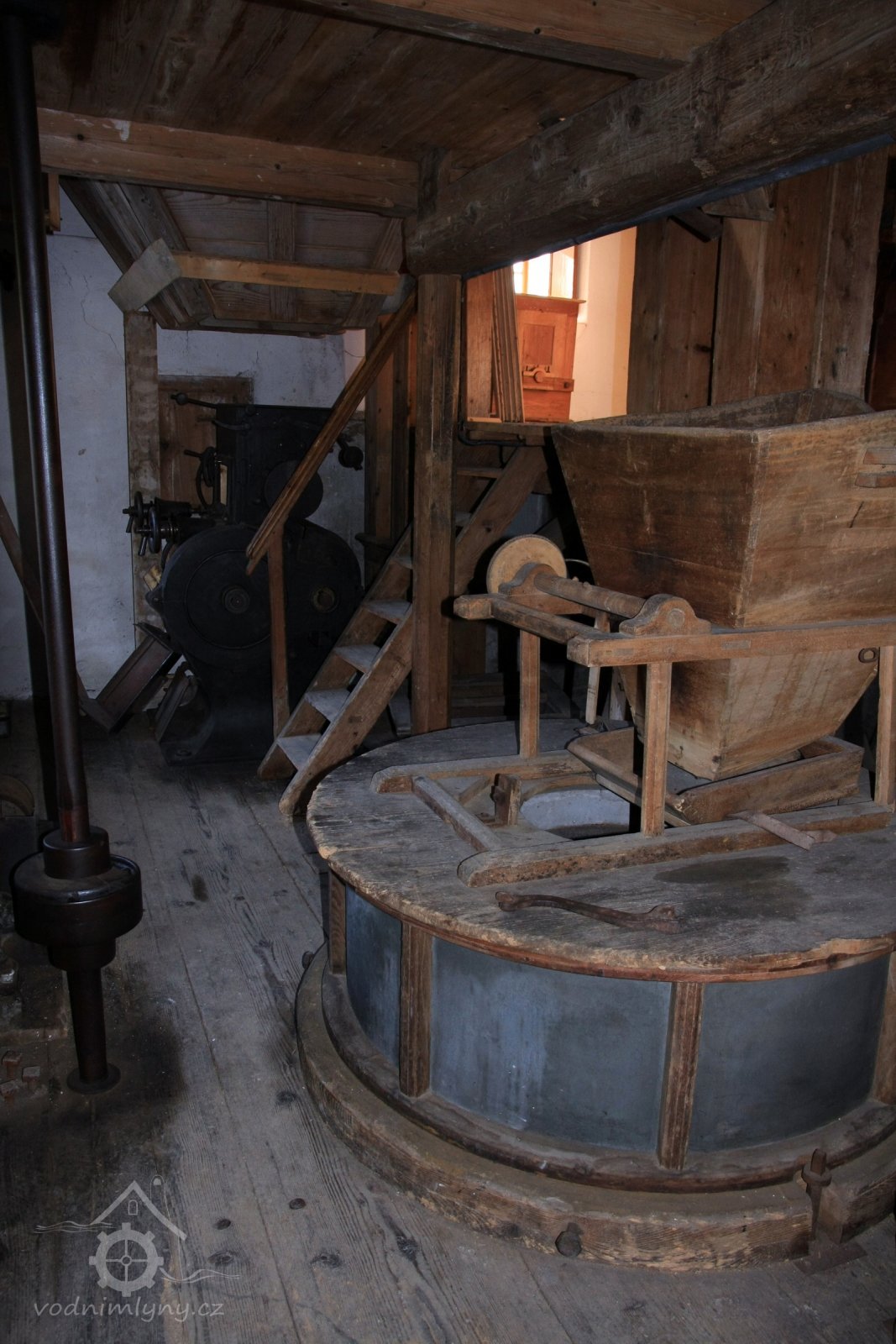 mlýnská podlaha, dvě složení (v popředí šrotovník bez násypného koše a lubu) a v pozadí válcová stolice, 09 2014, © Alena Borovcová, (Prvky na obrázku: kamenné složení (šrotovací, mlecí))