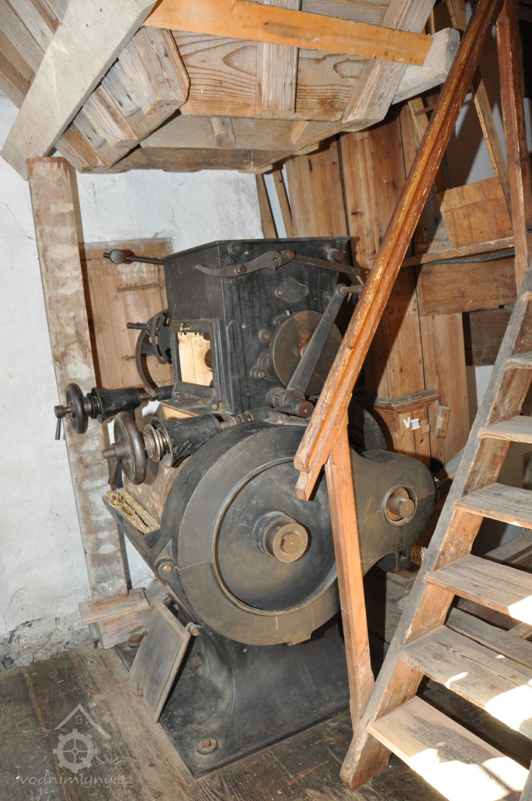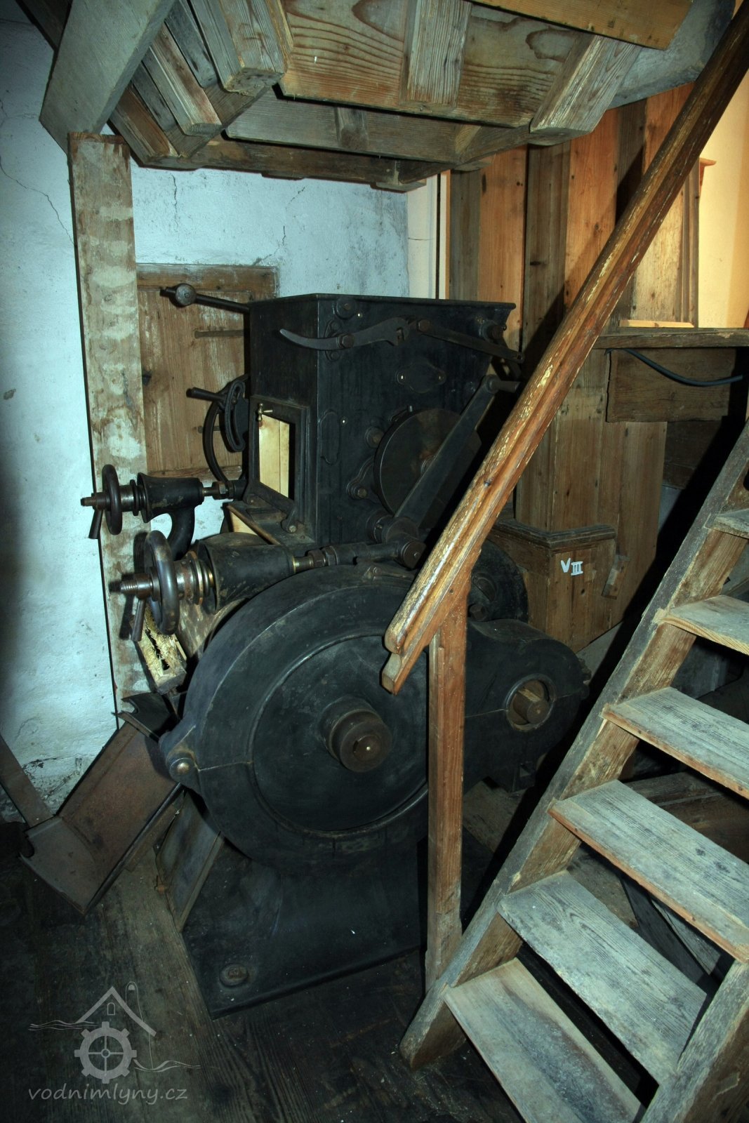 - válcová mlecí stolice v litinové skříni s rýhovanými válci, výrobce J. Hübner a K. Opitz - Pardubice z roku 1898, 2014, © David Veverka, (Prvky na obrázku: válcová stolice)