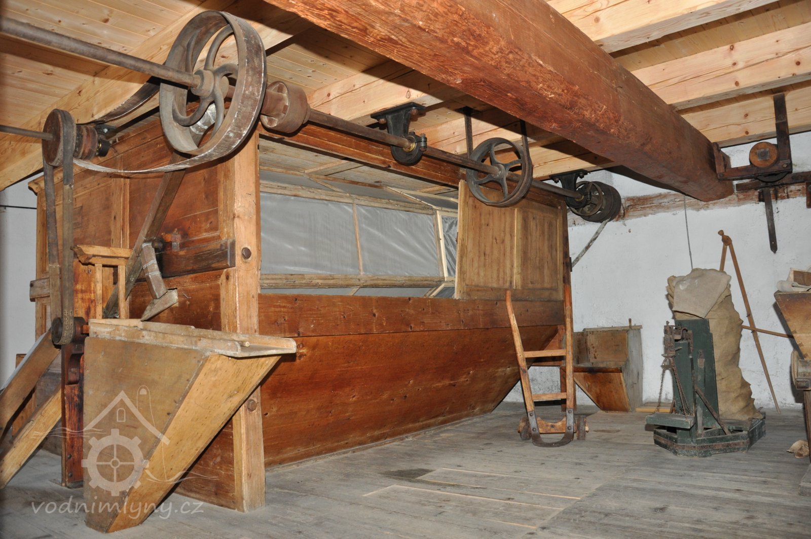 pohled na stroje v podstřeší, 2014, © David Veverka, (Prvky na obrázku: transmise, řemenice, převody, vysévač hranolový, výtahy a dopravníky)