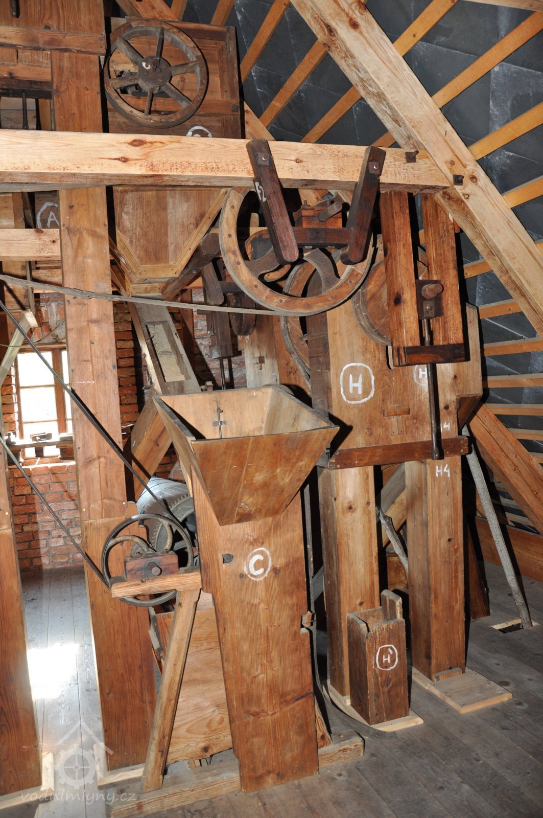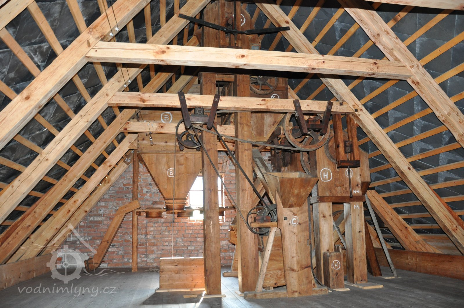 pohled na stroje v podstřeší, 2014, © David Veverka, (Prvky na obrázku: transmise, řemenice, převody, koukolník, vysévač hranolový, výtahy a dopravníky)