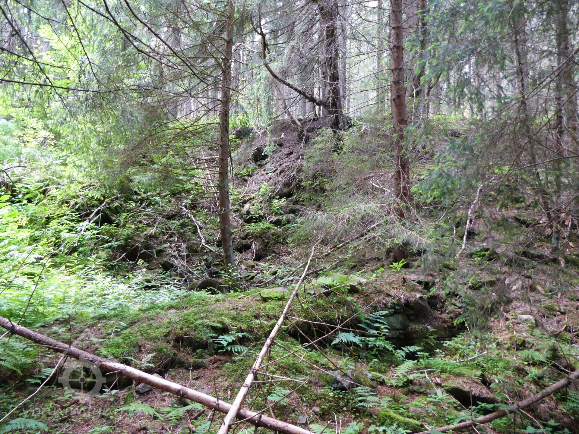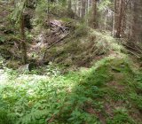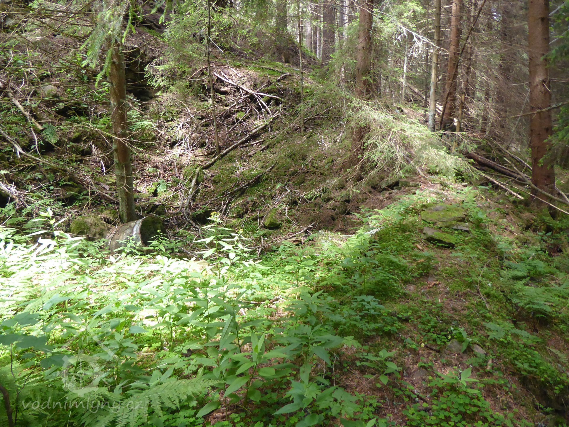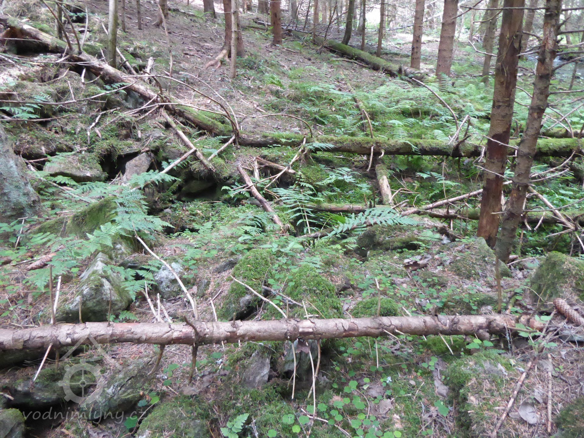 V lese nad mlýnem je těžko viditelná sníženina, kudy probíhal náhon.