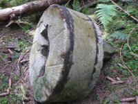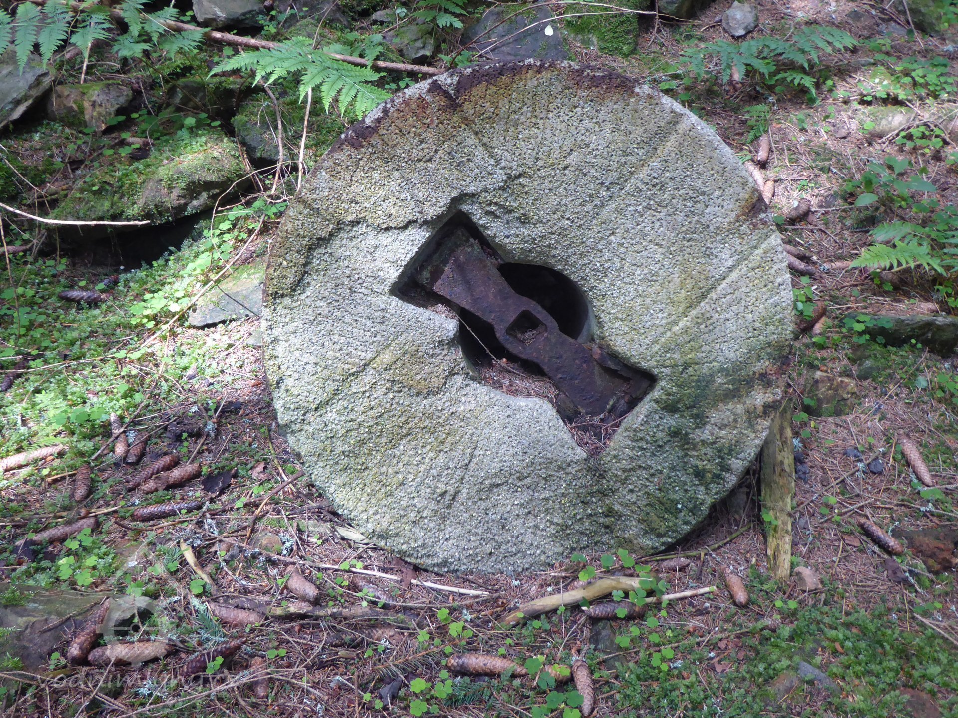 Pod žlutě značenou turistickou cestou jsou patrné zbytky zdí a i mlecí kámen mlýna.