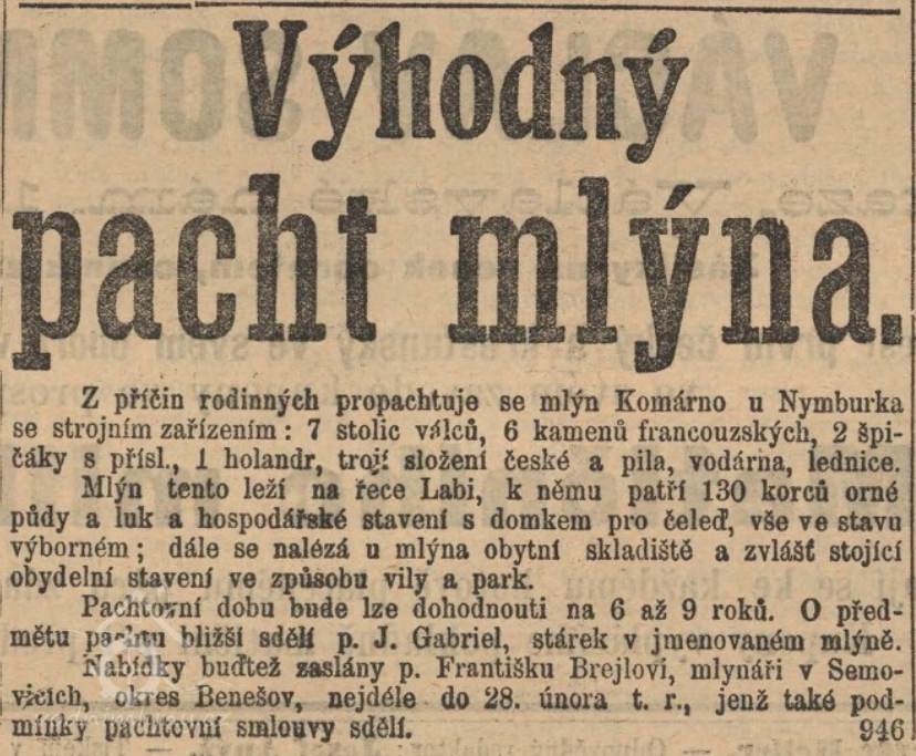V lednu 1910 byl mlýn nabízen k pronájmu na 6-9 let. (RR)