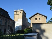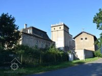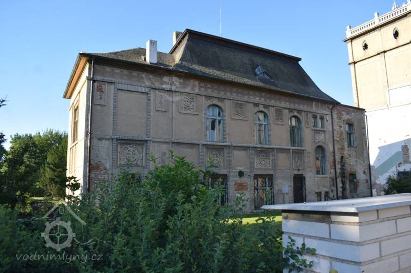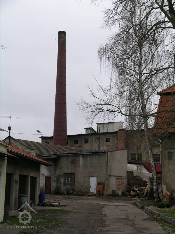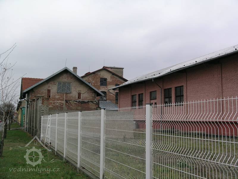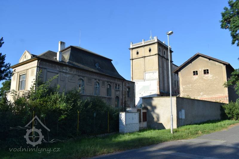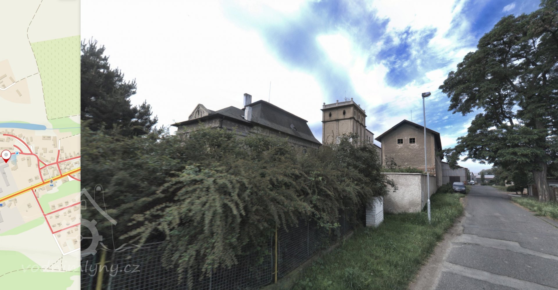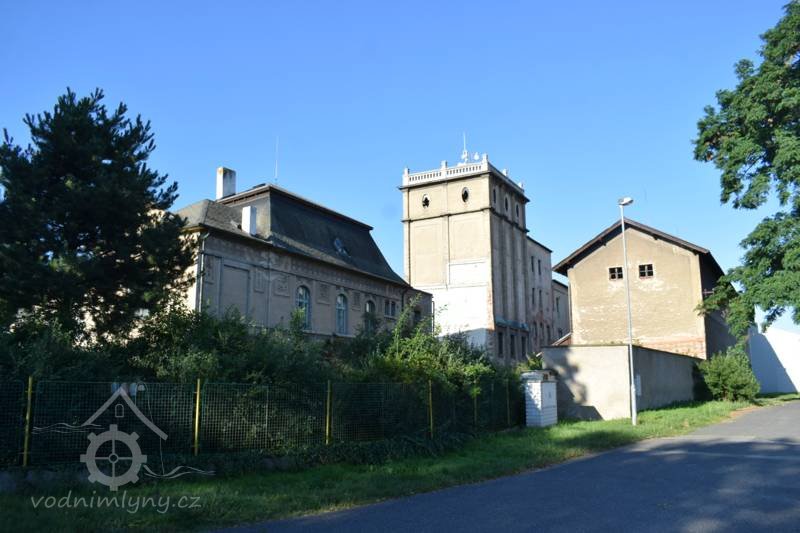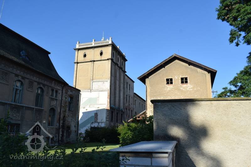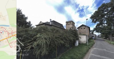Vjezd do areálu a mlýn v pozadí, červenec 2016, © viz mapy.cz