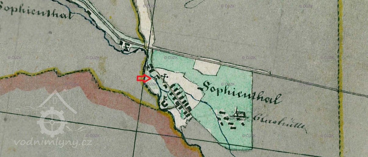 Roku 1790 zmíněn v osadě mlýn. Stabilní katastr z roku 1838 – obdélníková již nespalná budova s jedním kolem, za cestou menší spalná budova, vlastníkem hrabě Stadion. 1845 – mlynářem je Andreas Braun.