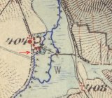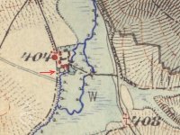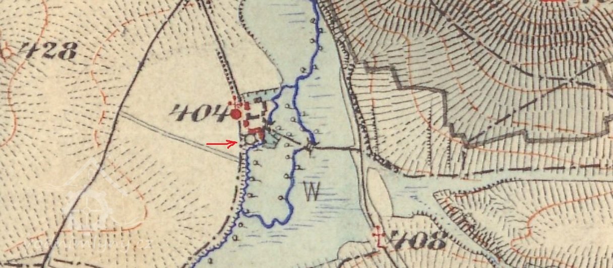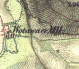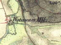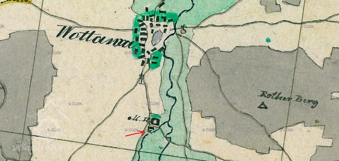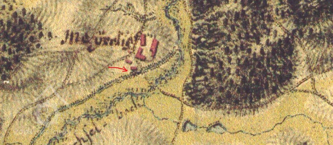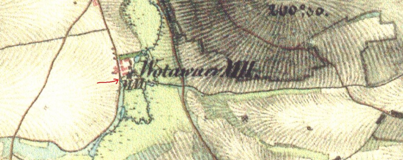 Indikační skica i Otisk stabilního katastru v roce 1838 zaznamenávají mlýnský náhon z Černého potoka, větší nespalnou budovuse dvěma koly, kolmo je umístěna menší spalná budova a vedle mlýna další menší spalná, zřejmě hospodářská, budova. Za náhonem stojí ještě další obdélníková spalná budova. Majitelem je Johann Held. Mlýn je v sousedství zemědělského dvora, nedaleko je i zděná kaplička.