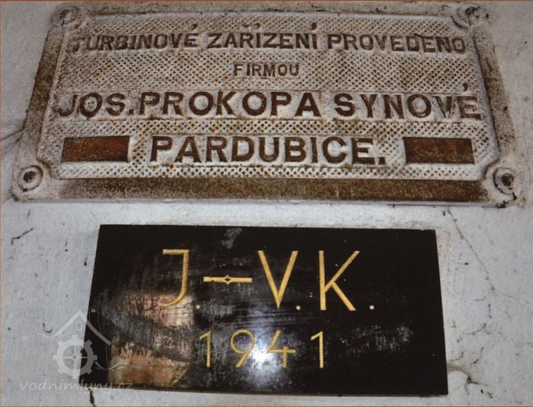 1930: 1 kolo na svrchní vodu, hltnost 0,724 m3/s, spád 2,5 m, výkon 16,8 HP