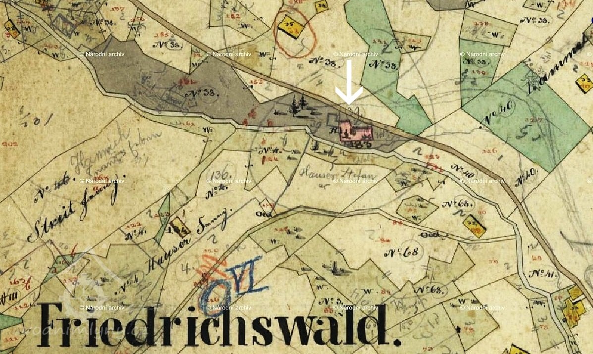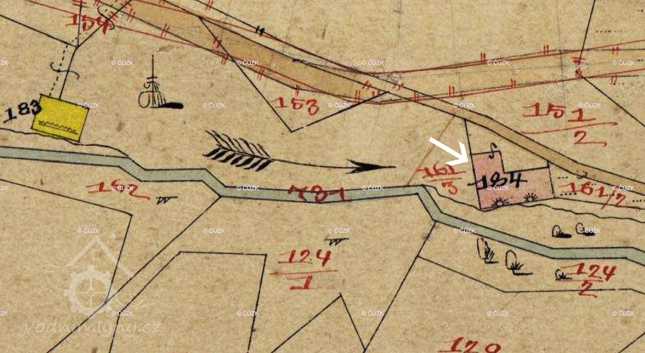 Mlýn vznikl někdy kolem poloviny 19. století na pozemku čp. 38. Načrtnut je teprve dodatečně na indikační skice.