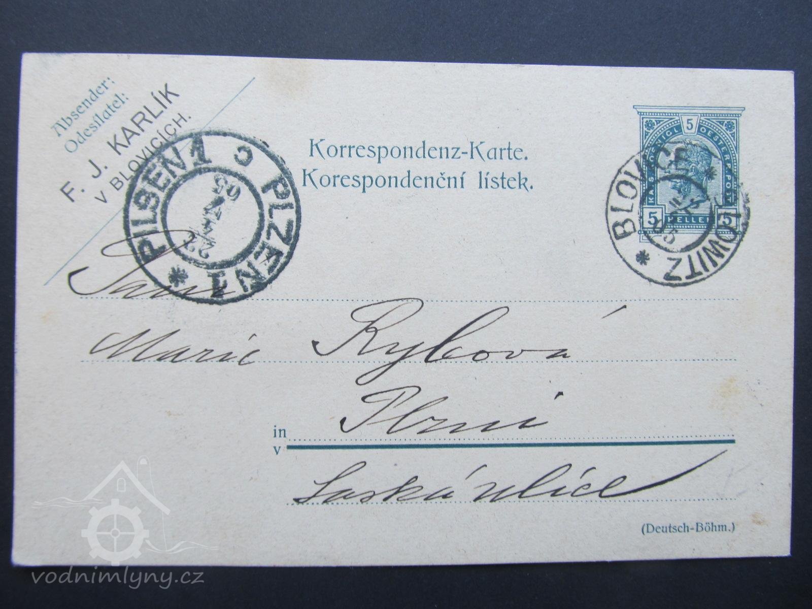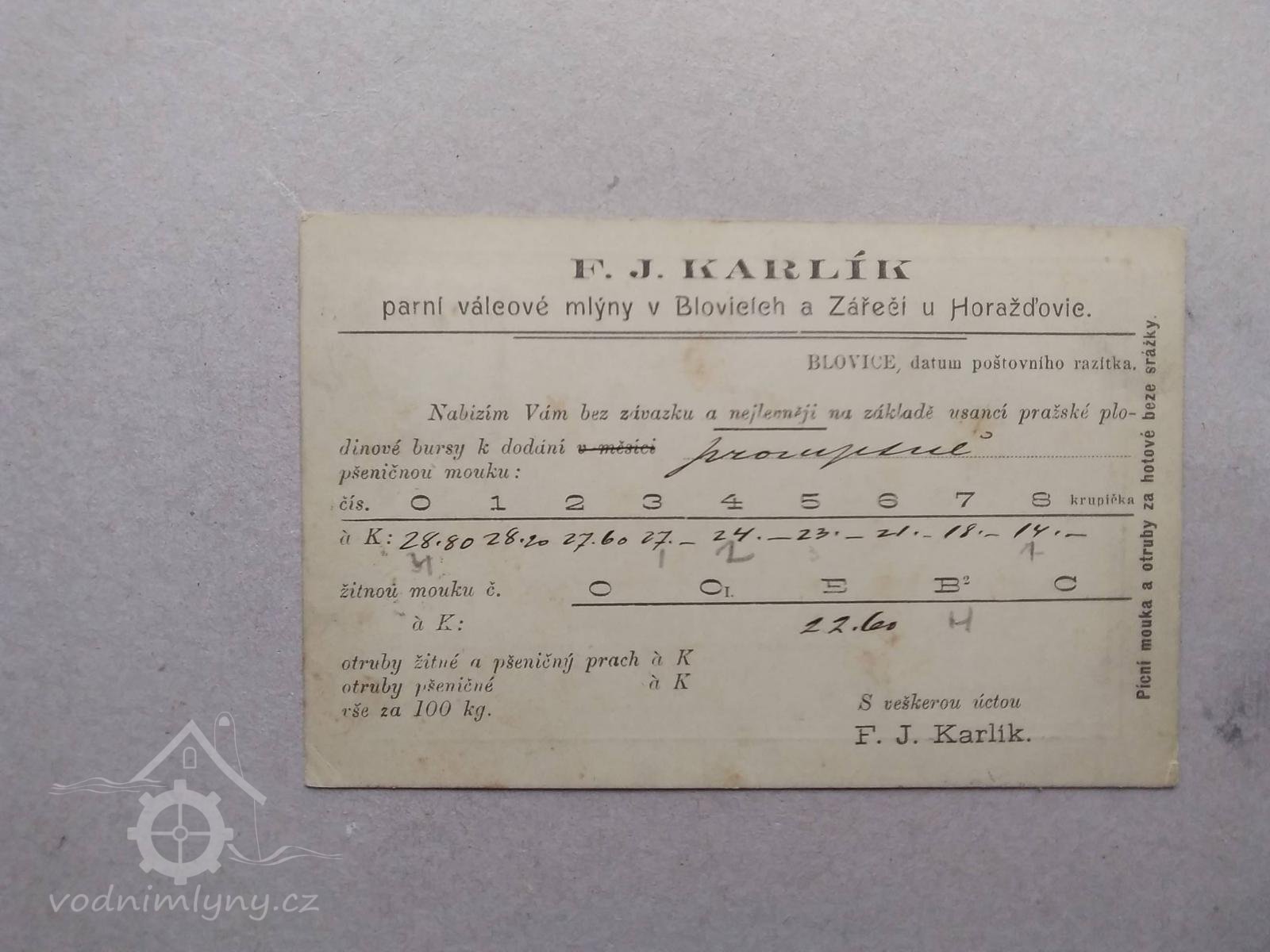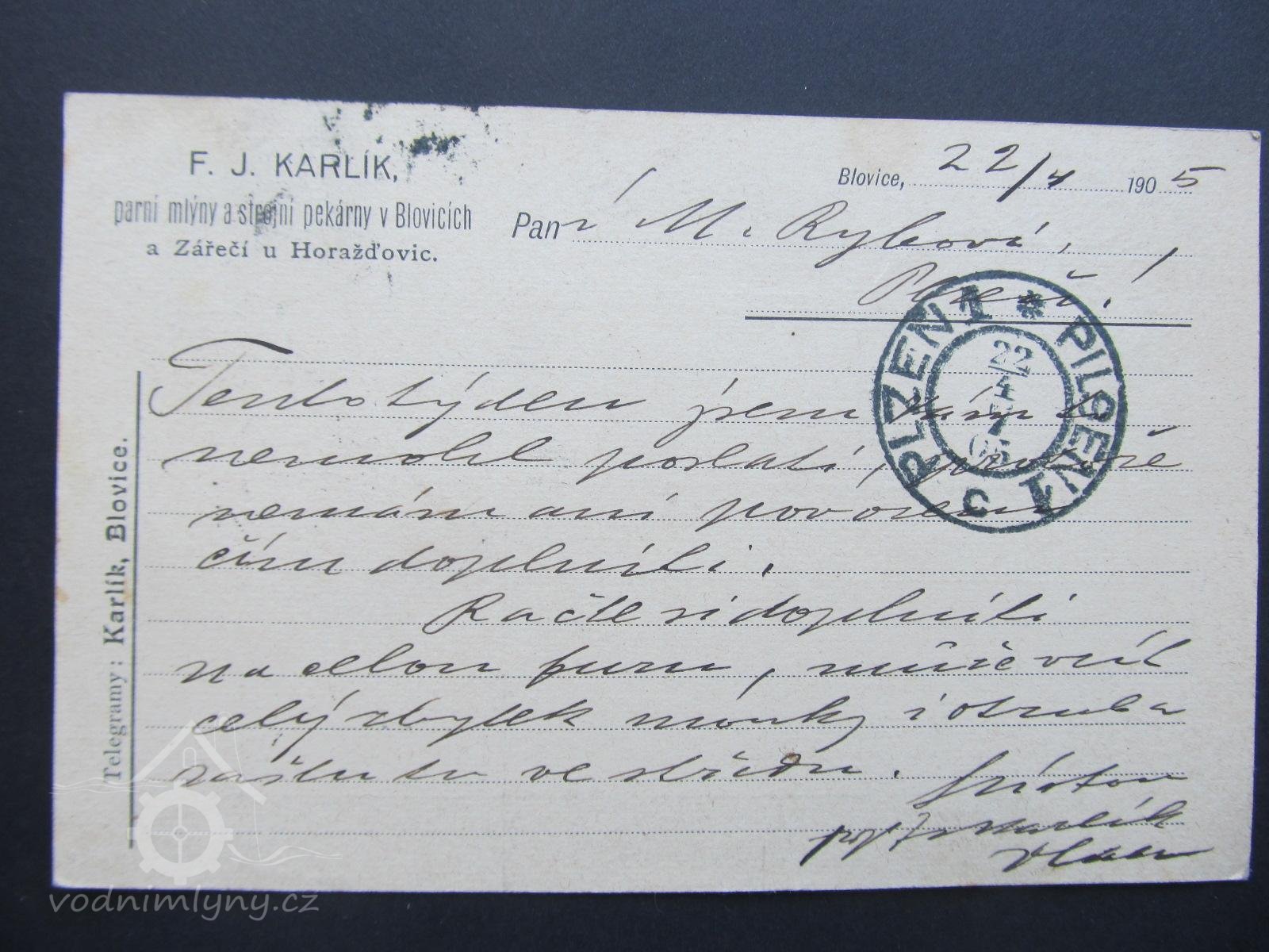 6.1.1907 založena společnost "F.J.Karlík a spol., parní mlýny a strojní pekárny v Blovicích a Zářečí u Horažďovic, spol. s ručením omezeným"