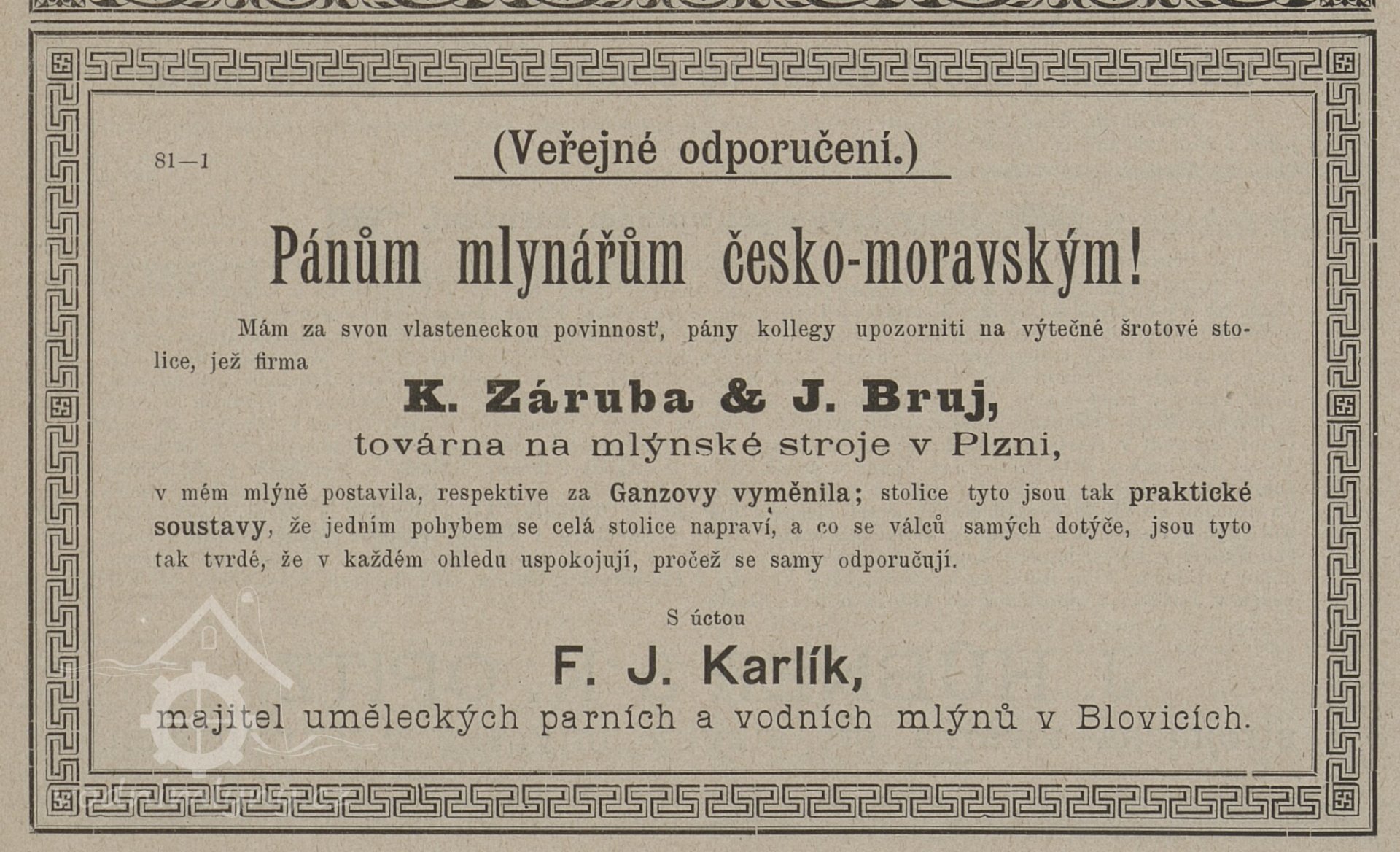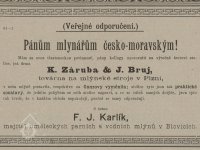František Dobiáš, zamýšlel založit společnost "František Dobiáš, majitel parních mlýnů býv. firmy F.J.Karlík v Blovicích č.p. 82"