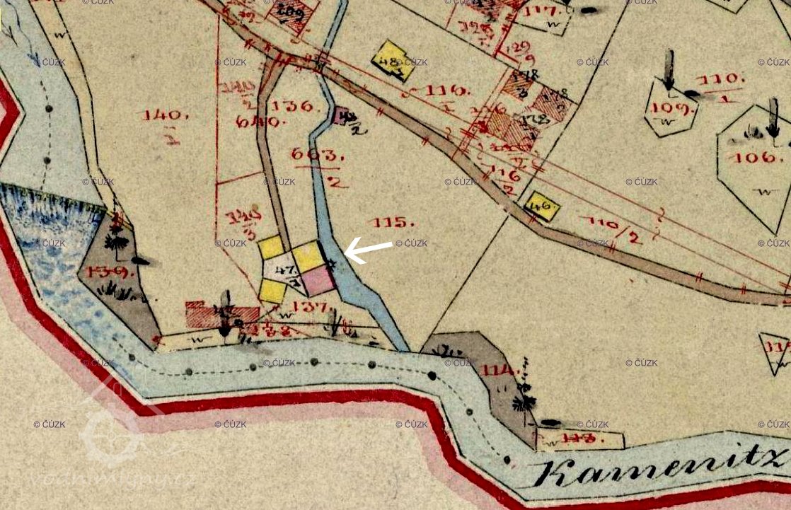 Mlýn původně nabíral vodu z Červeného potoka, později jezem z říčky Kamenice.