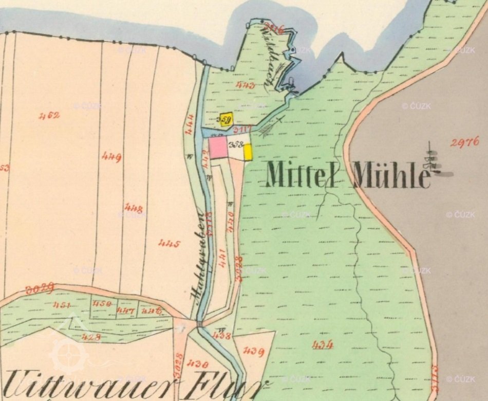 Tři vodní kola jsou vyznačena i na mapě indikační skici stabilního katastru z roku 1841, na mapě císařského otisku stabilního katastru jsou vyznačena kola dvě.